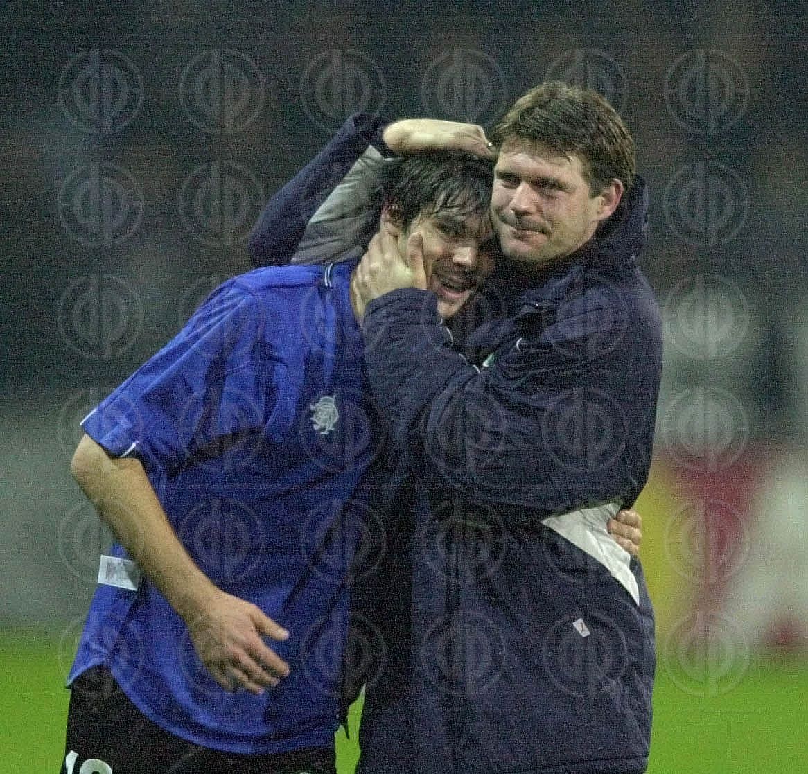 Objektbeschreibung: von links Andres Fleurquin, Tormann Jesper Christansen, Bert Konterman