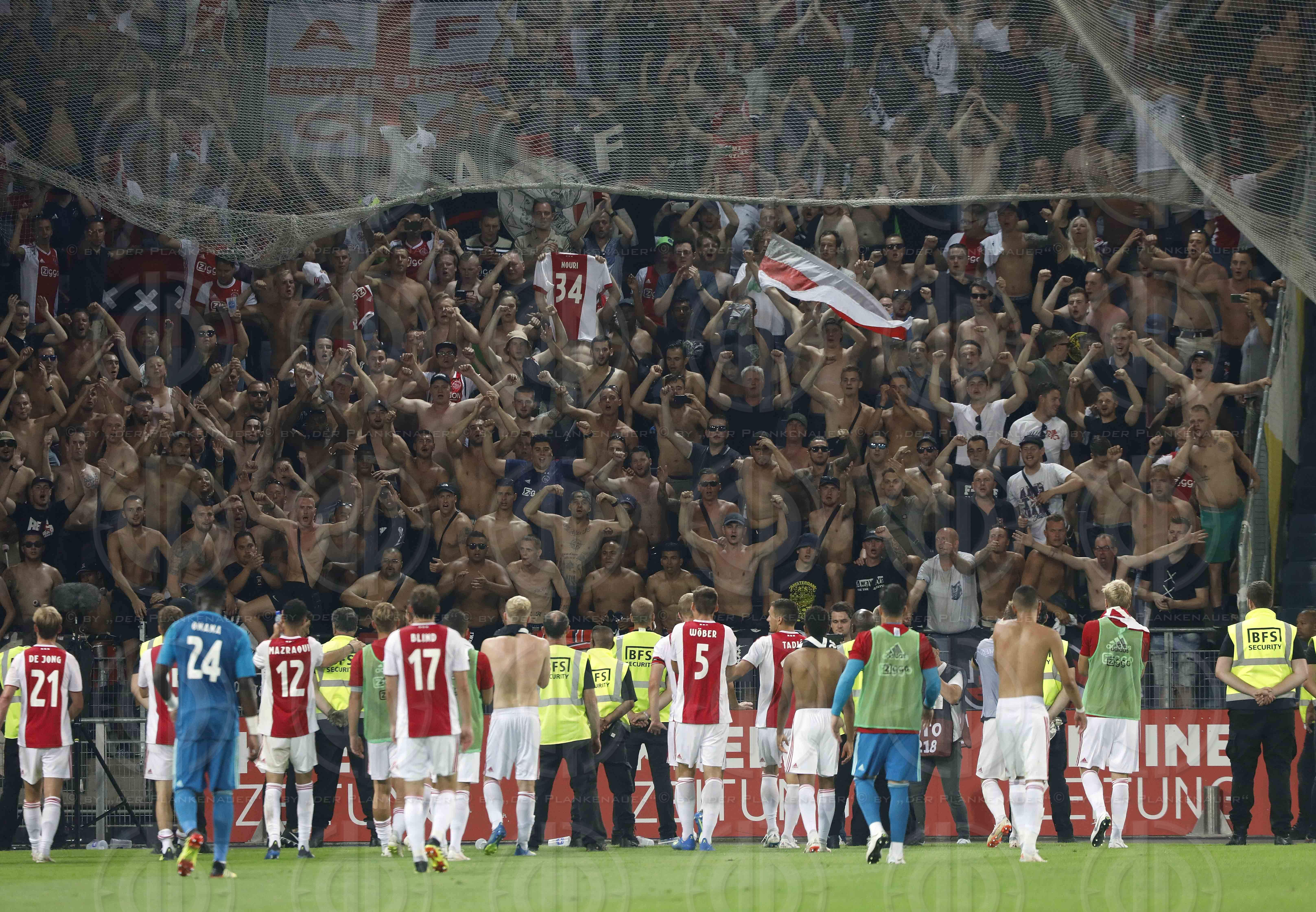 Fussball UEFA Champions League 2.Qualifikationsrunde Rueckspiel SK Puntigamer Sturm Graz vs. AFC Ajax Amsterdam (1:3 Endstand, 0:1 Pause) am 01.08.2018.Bild zeigt: v.l. Ajax Fans jubeln mit der Mannschaft.