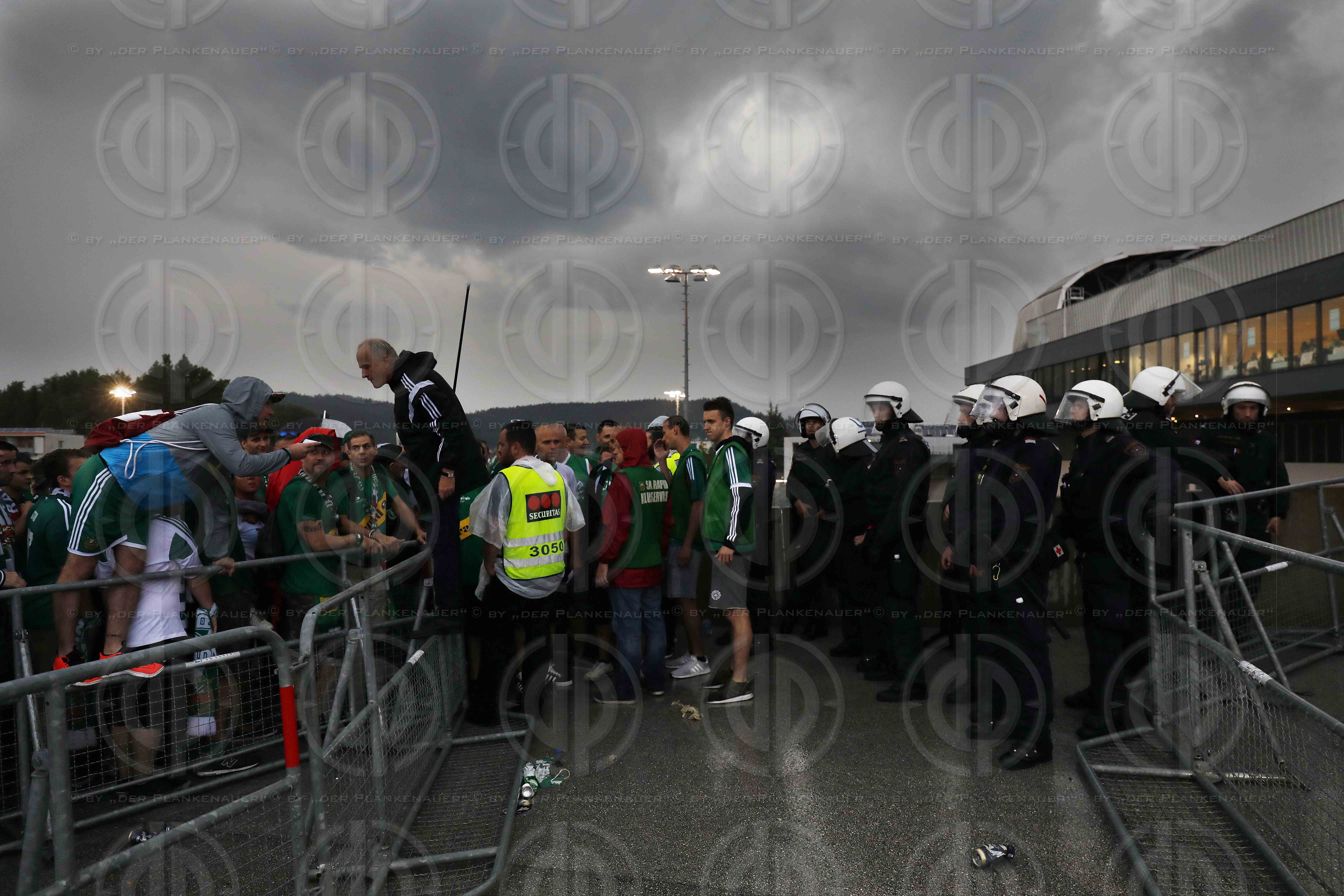Bild zeigt: v.l. Rapid Fans und Polizei bei stroemenden Regen.