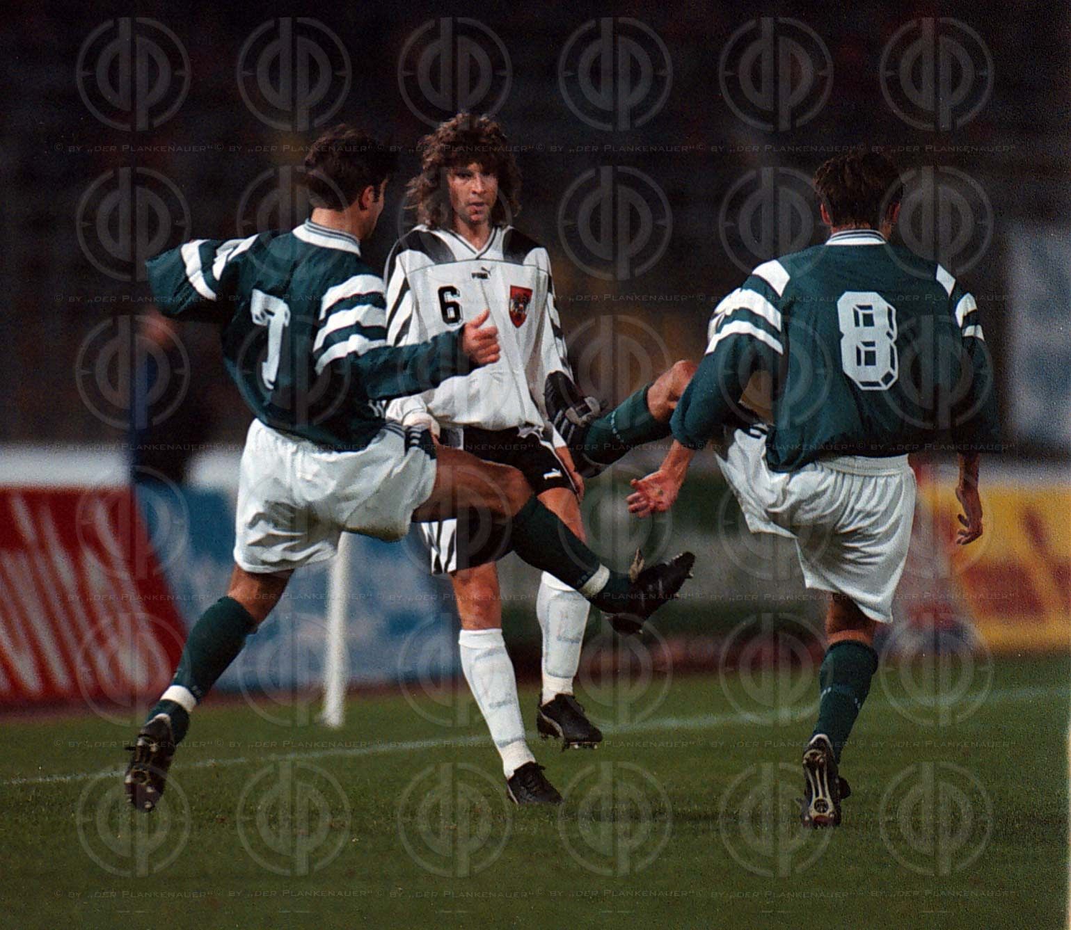 Wolfgang Eder GAK im Luftkampf mit Rainer Hoffmann. Links Gerd Wimmer Neg. 970053-7