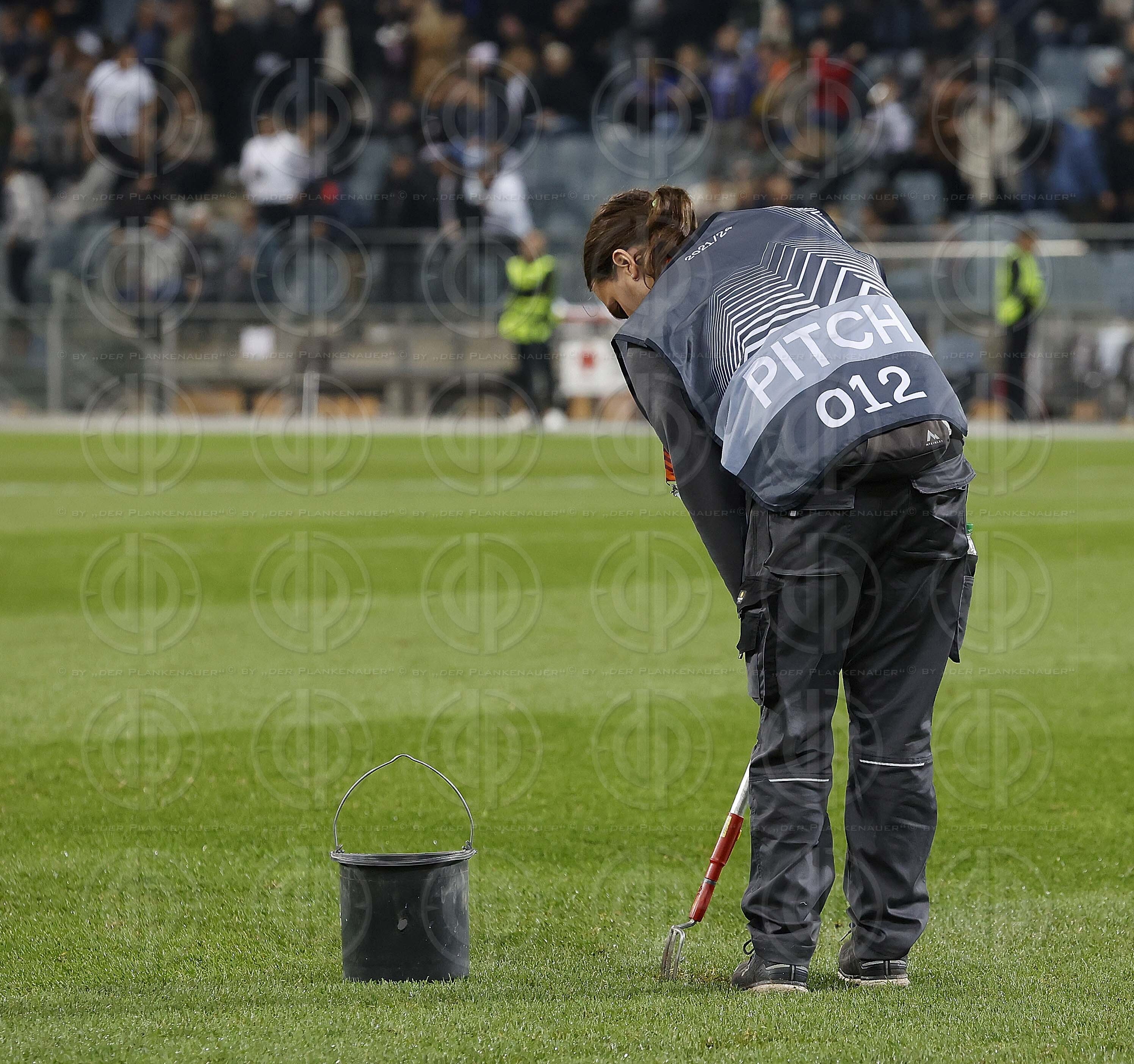 Bild zeigt: v.l. Rasenpflege in der Halbzeit.