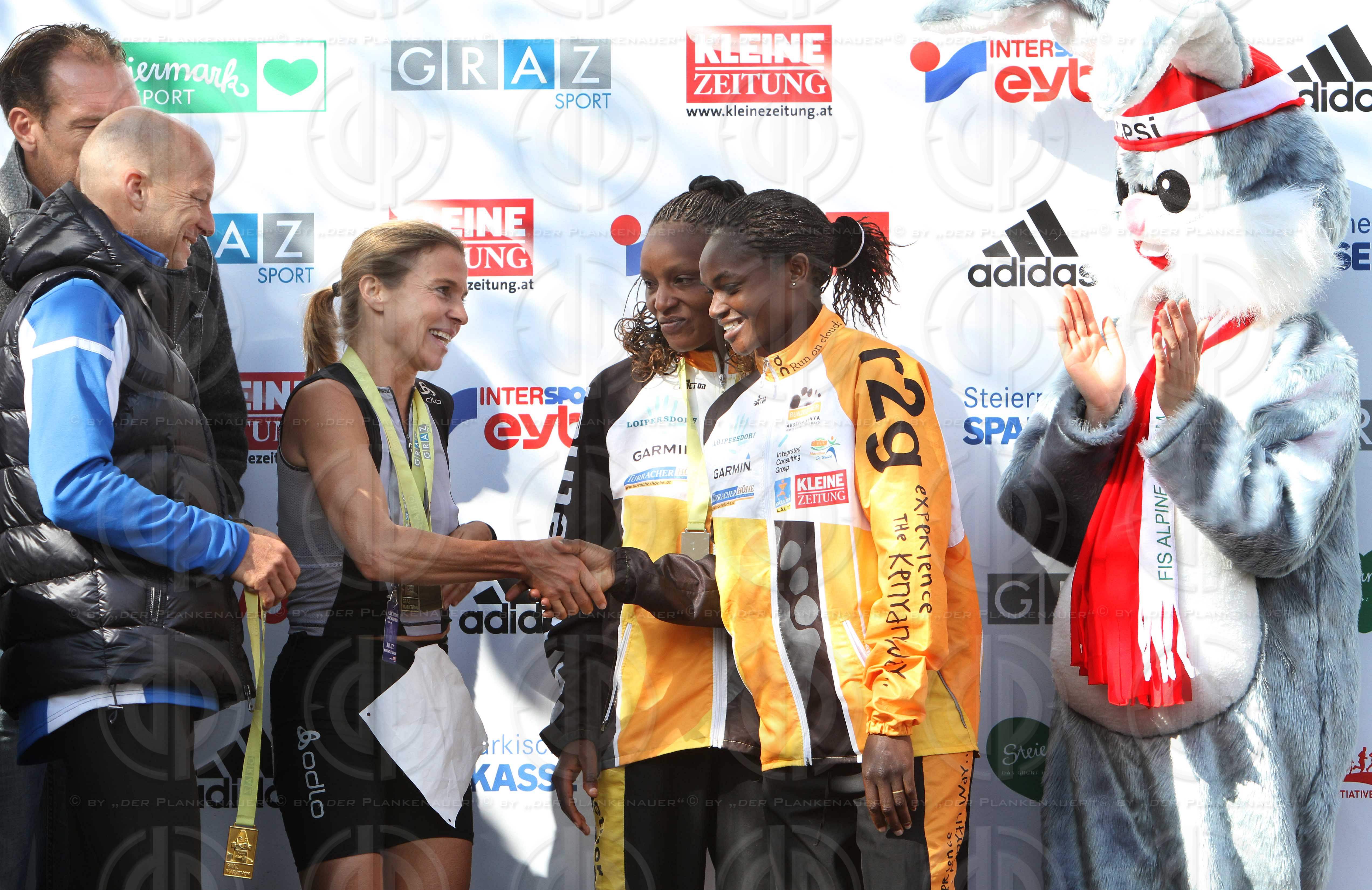 Bild zeigt: v.l. KLZ Marketing-Leiter Michael KUMMERER, Gerhard GOLDBRICH, MMag. Michaela FUCHS gratuliert Esther WANJIRU-MACHARIA (1.) und Cecilia WANGUI-WARUTUMO (2.), WM 2013 Schladming Hopsi.
