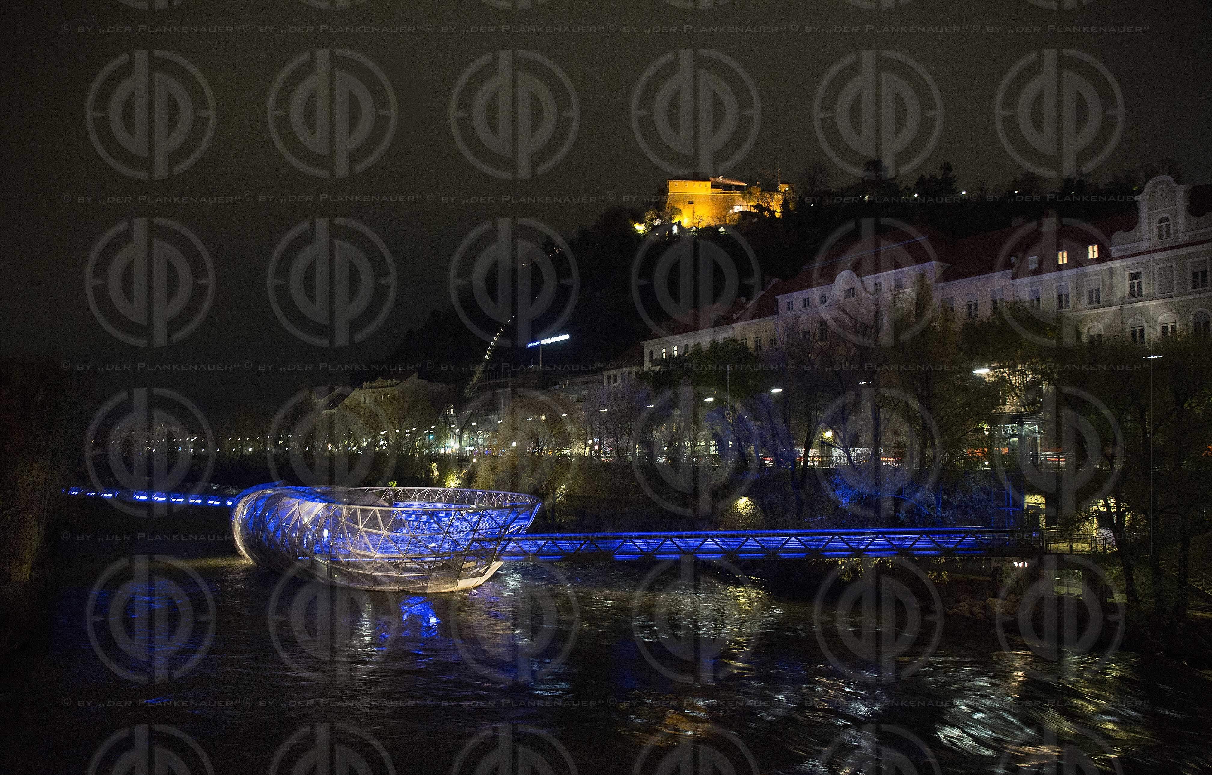Bild zeigt: Blick vom Mursteg auf die Murinsel, die schwimmende Plattform wurde nach einer Idee von Robert Punkenhofer vom New Yorker Künstler Vito ACCONCI geschaffen. Im Hintergrund der Kaiser-Franz-Josefs- Kai und der Schlossberg mit der Kanonenbastei.