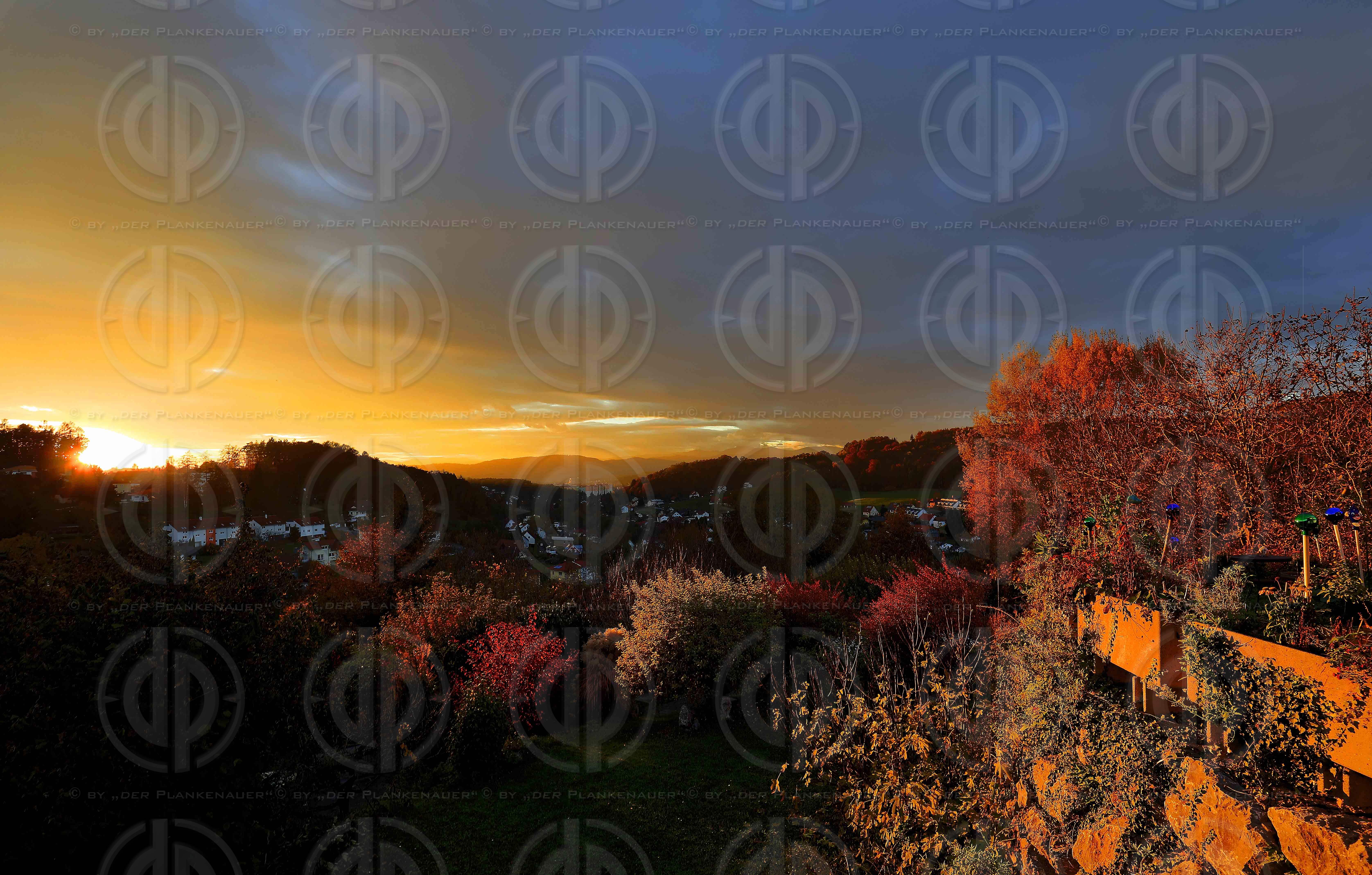Bild zeigt: Die untergehende Sonne laesst die Herbstfarben von Baeumen und Straeuchern leuchten. Blick von der Roseggerhoehe ueber das Ragnitztal, LKH und den Rieshang nach Westen.