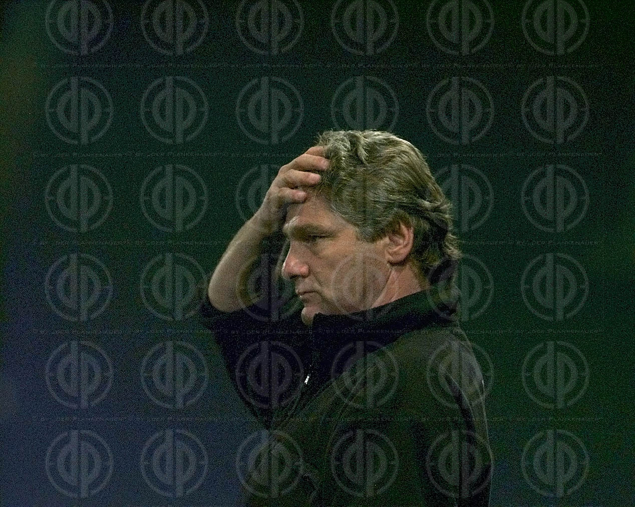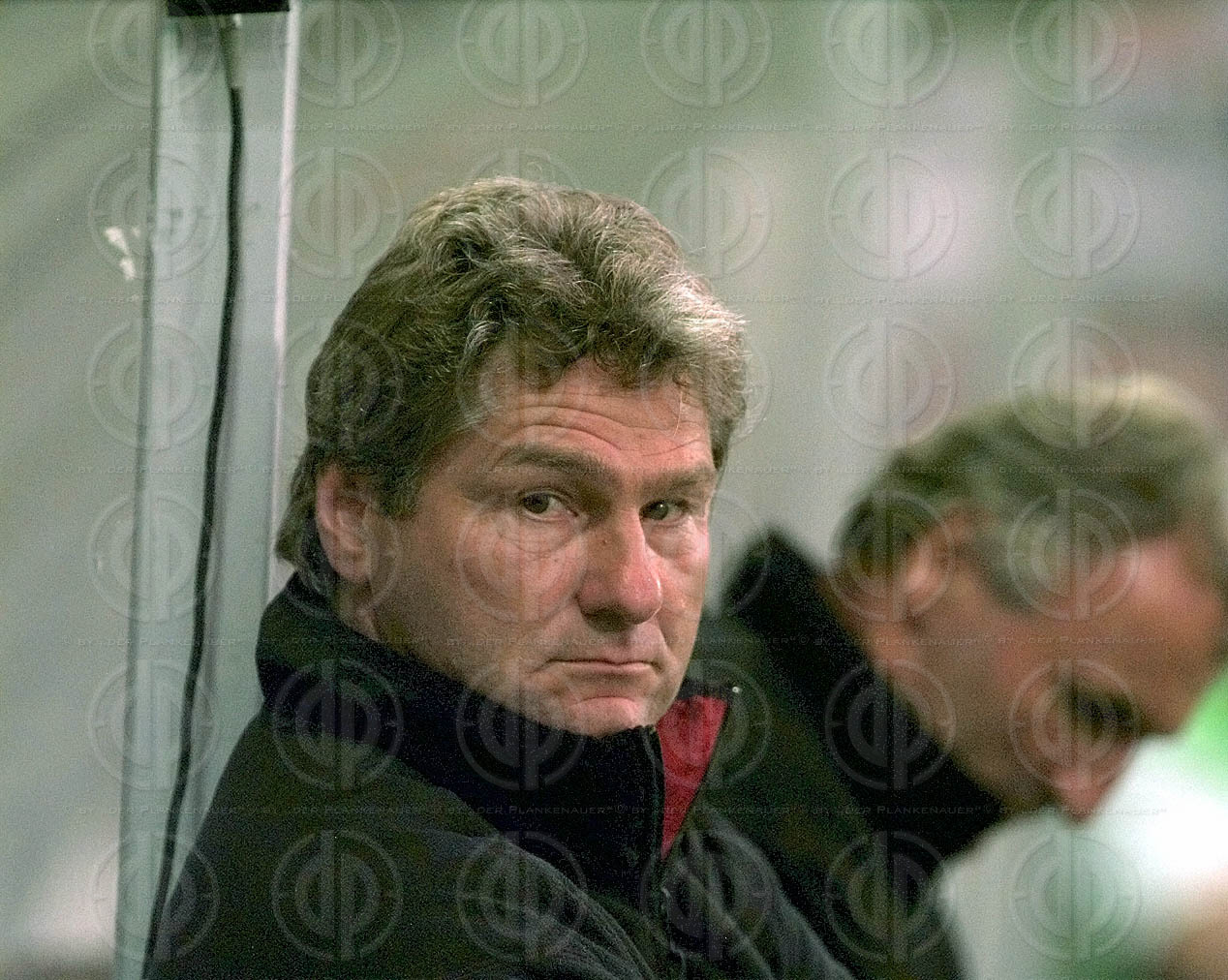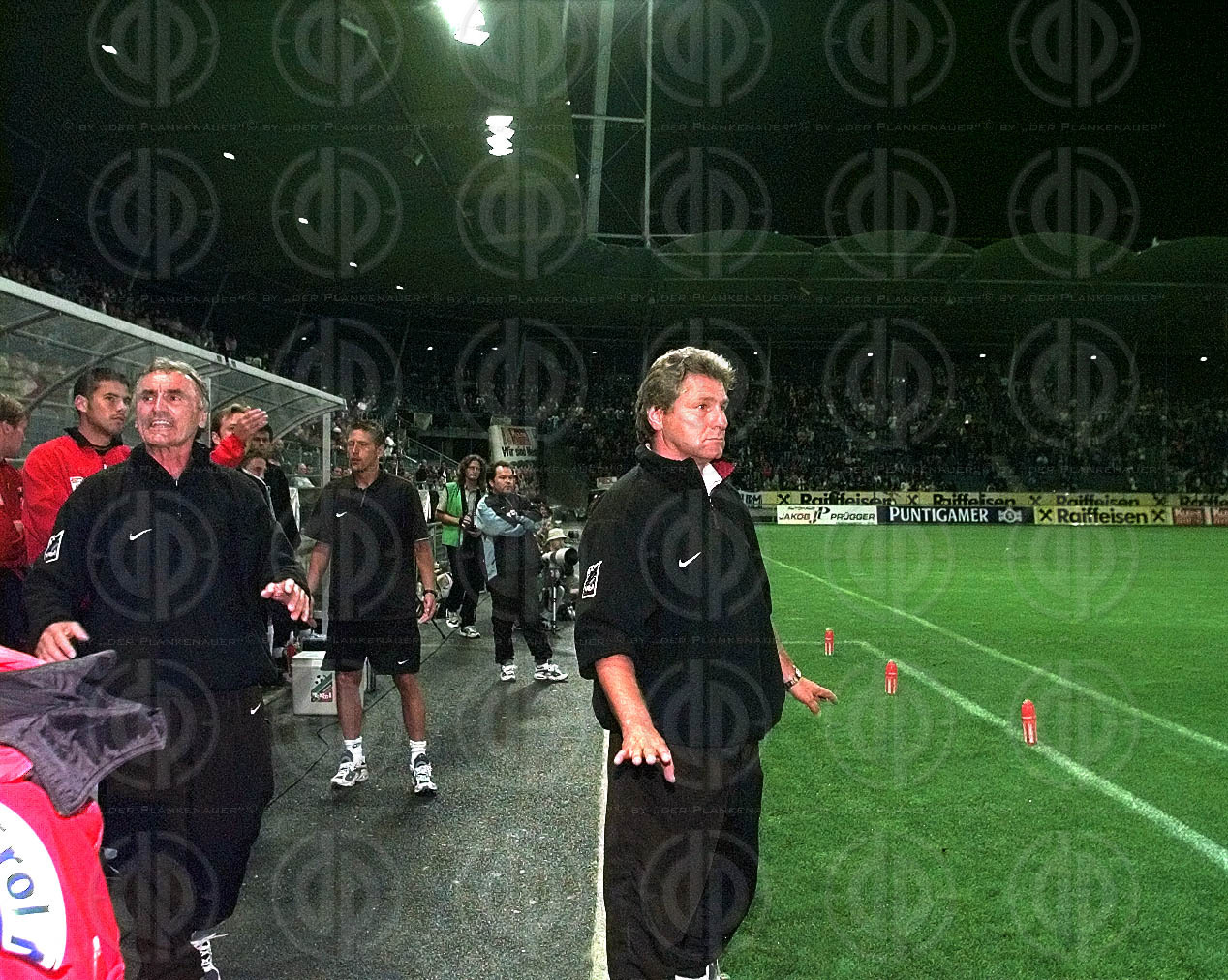 Objektbeschreibung: Trainer Kurt Jara beruhigt, von links heinz Binder, Mitte Zoran Barisic