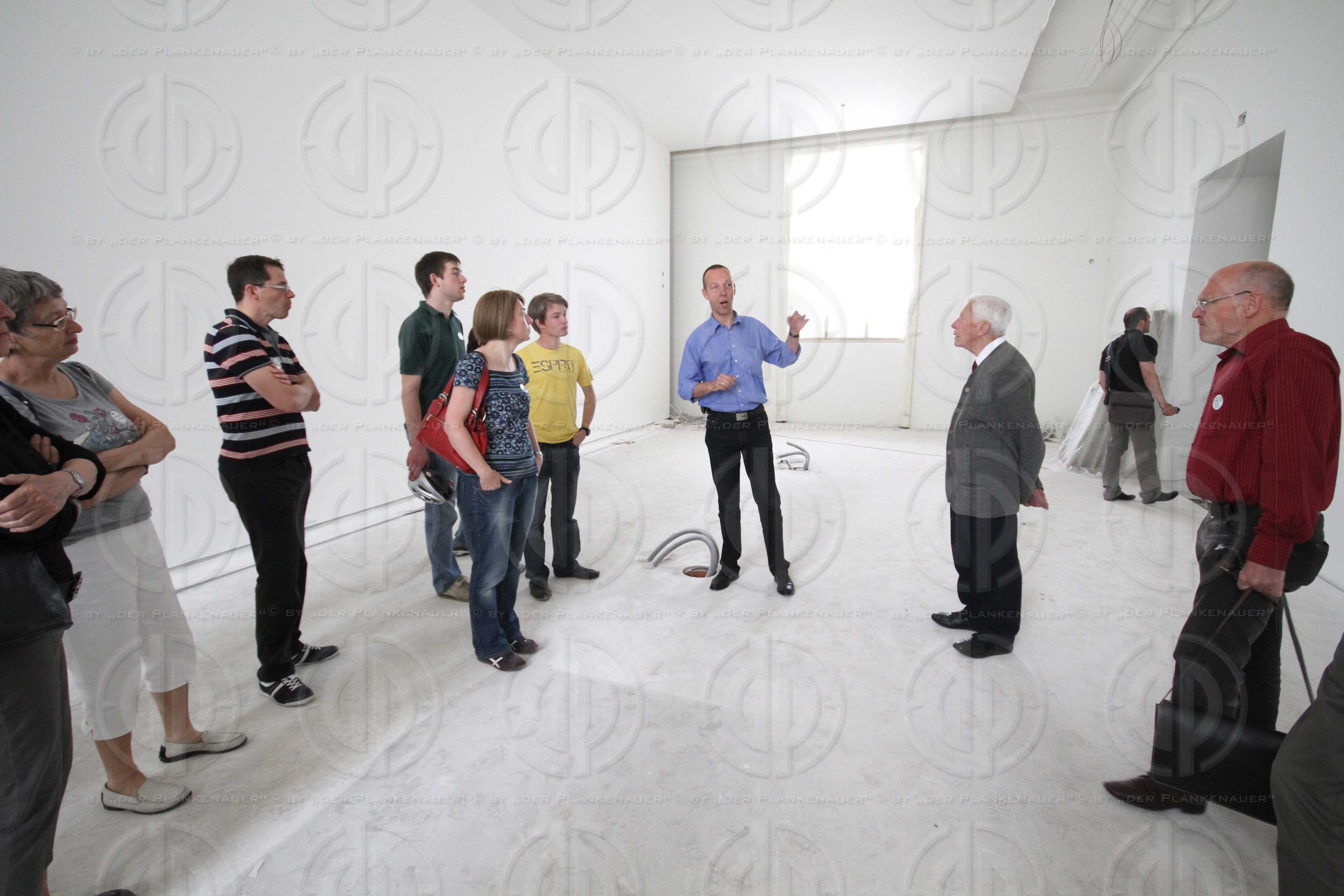 Bild zeigt: v.l. DI Carl SKELA, Bauleiter der LIG (Landesimmobiliengesellschaft), erklärt interessierten besuchern die Museumräume im 1.Stock, rechts Dipl.-Ing. Josef KORBER (GAL).