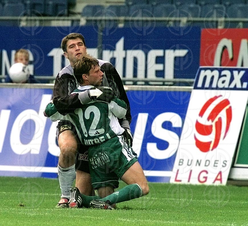 Objektbeschreibung:Jubel beim GAK. Von links Dieter Ramusch, Gregor Pötscher, auf der Spielertraube Benedict Agwuegbu, Innerhalb Marco Grimm und Djelko Radovic, rechts Ales Ceh