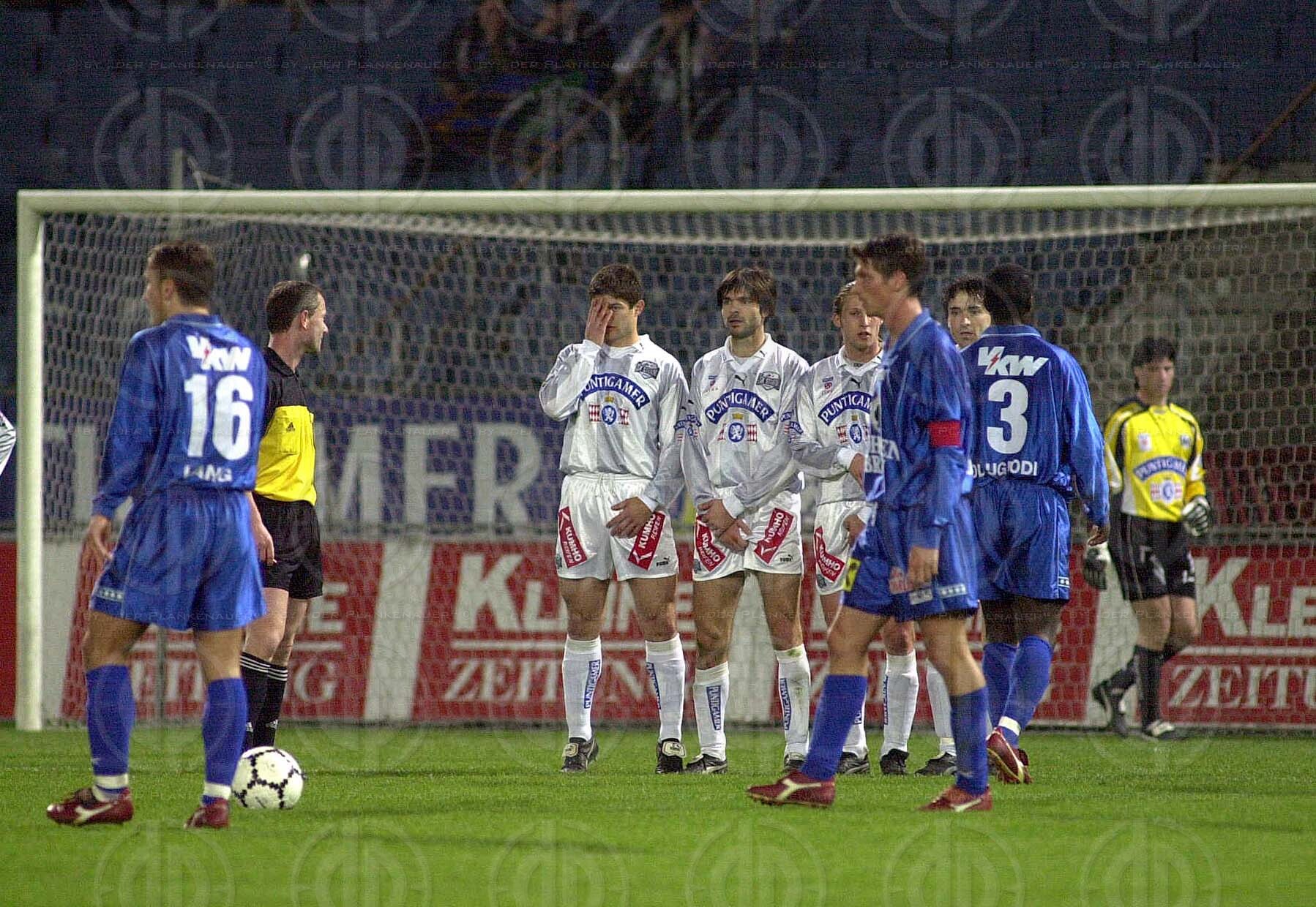 Objektbeschreibung: Mauer von links Giorgios Koutsoupias, Gilbert Prilasnig, György Korsos, vorne Theo Grüner, Jide Olugbodi und Tormann Josef Schicklgruber