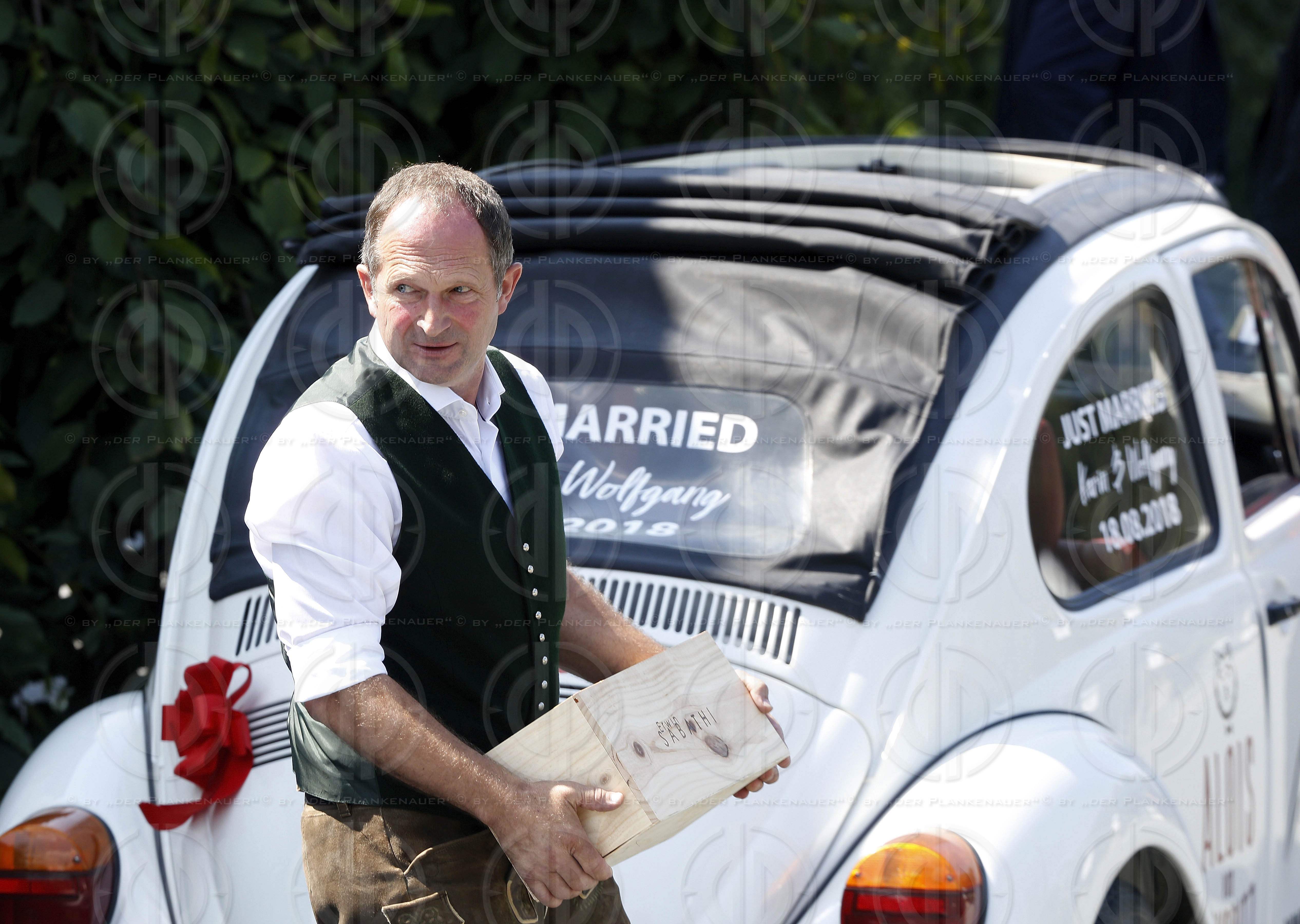 Bild zeigt: v.l. Alois KOEHRER vor seinem Hochzeitsgeschenk, dem VW-Kaefer mit Mehrwert.