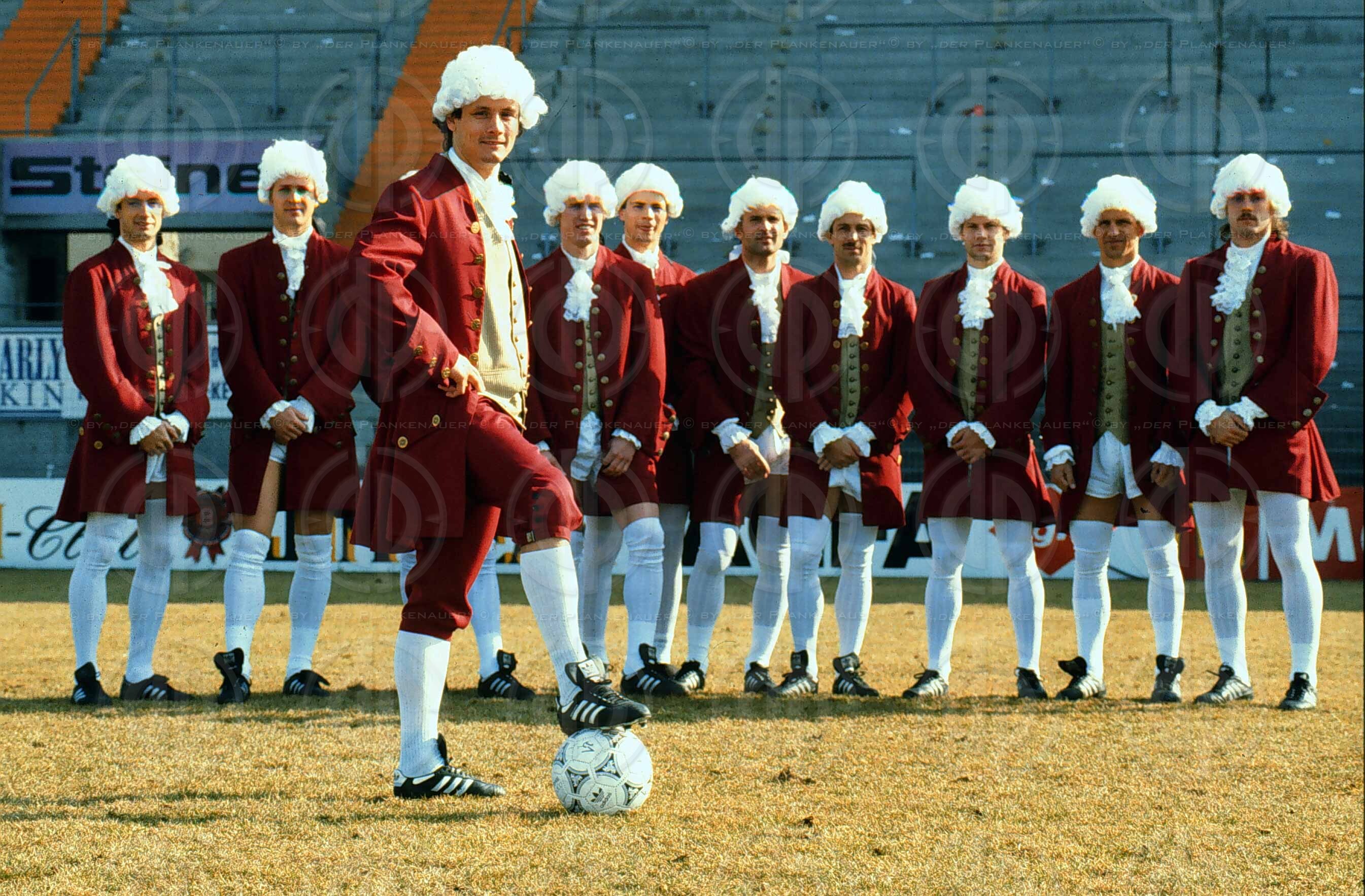 Im Mozart Jubiläumsjahrhaben sich die Salzburger Fussball als Mozartknaben verkleidet, 16.03.1991.