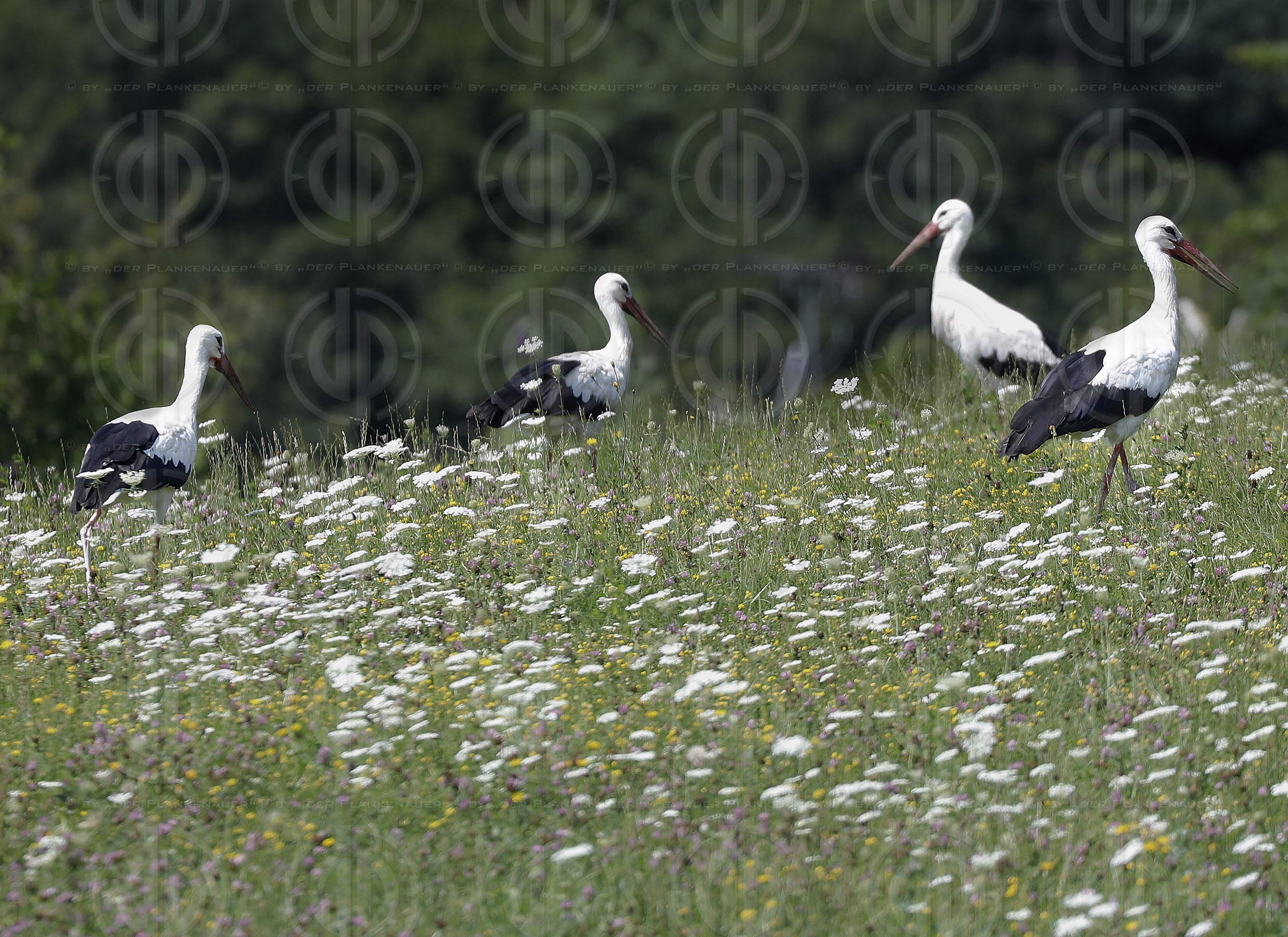 Bild zeigt: v.l. Nunmehr 4 Weißstörche Gast auf einer Wiese an der Grazer Stadtgrenze in Kainbach bei Graz.