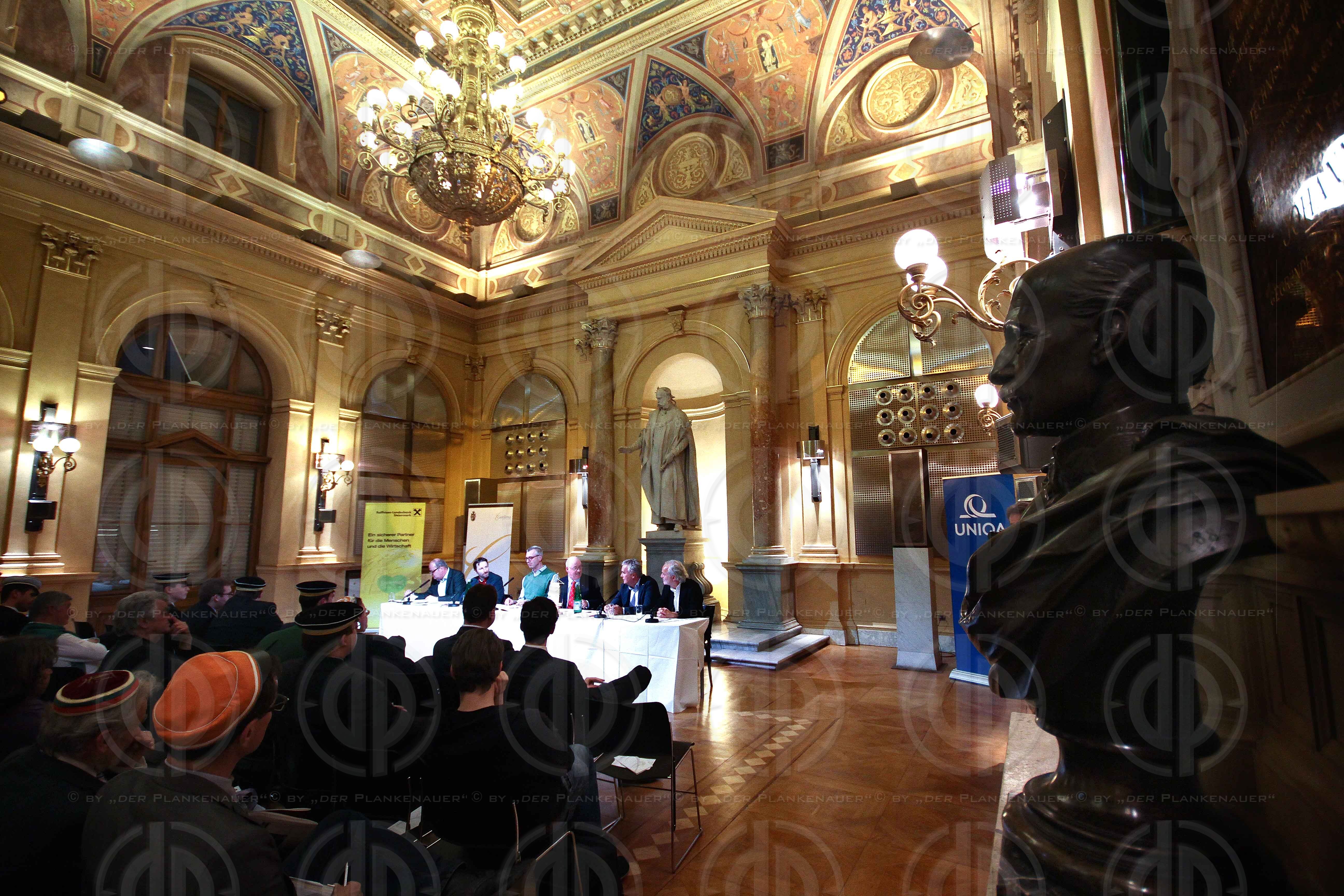 Bild zeigt: v.l. Besucher, am Podium Dr. Alfred GRINSCHGL (GF RTR), Dr. Ernst SITTINGER (Kleine Zeitung), Christoph BIRO (CR Kronen Zeitung Stmk.), Univ.-Prof. Dr. Stefan KARNER (Moderation), Gerhard DRAXLER (LD ORF Steiermark), Dr. Walter MÜLLER (der Standard).