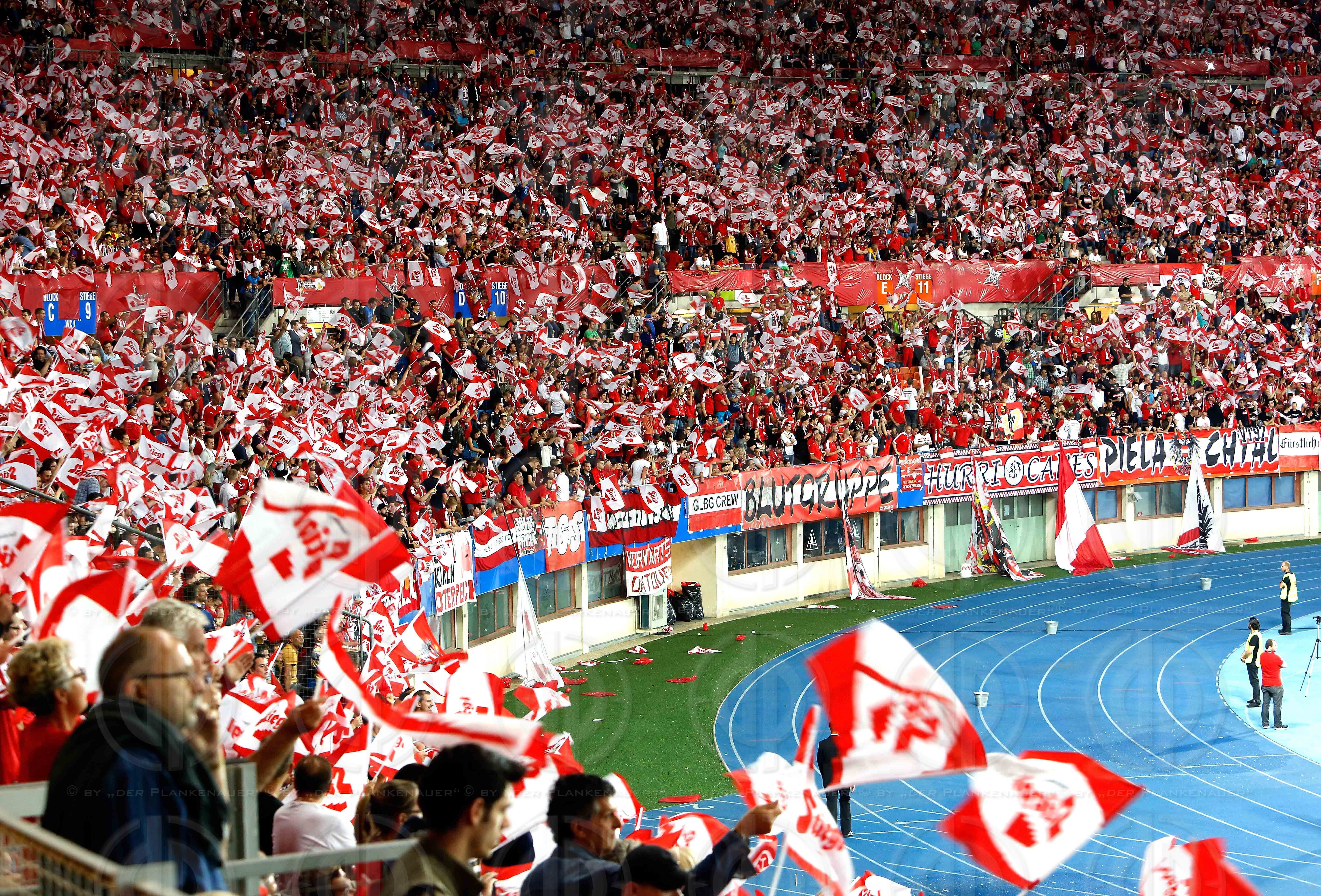 Bild zeigt: v.l. Fans mit Rot-Weiss-Roten Stiegel-Fahnen.