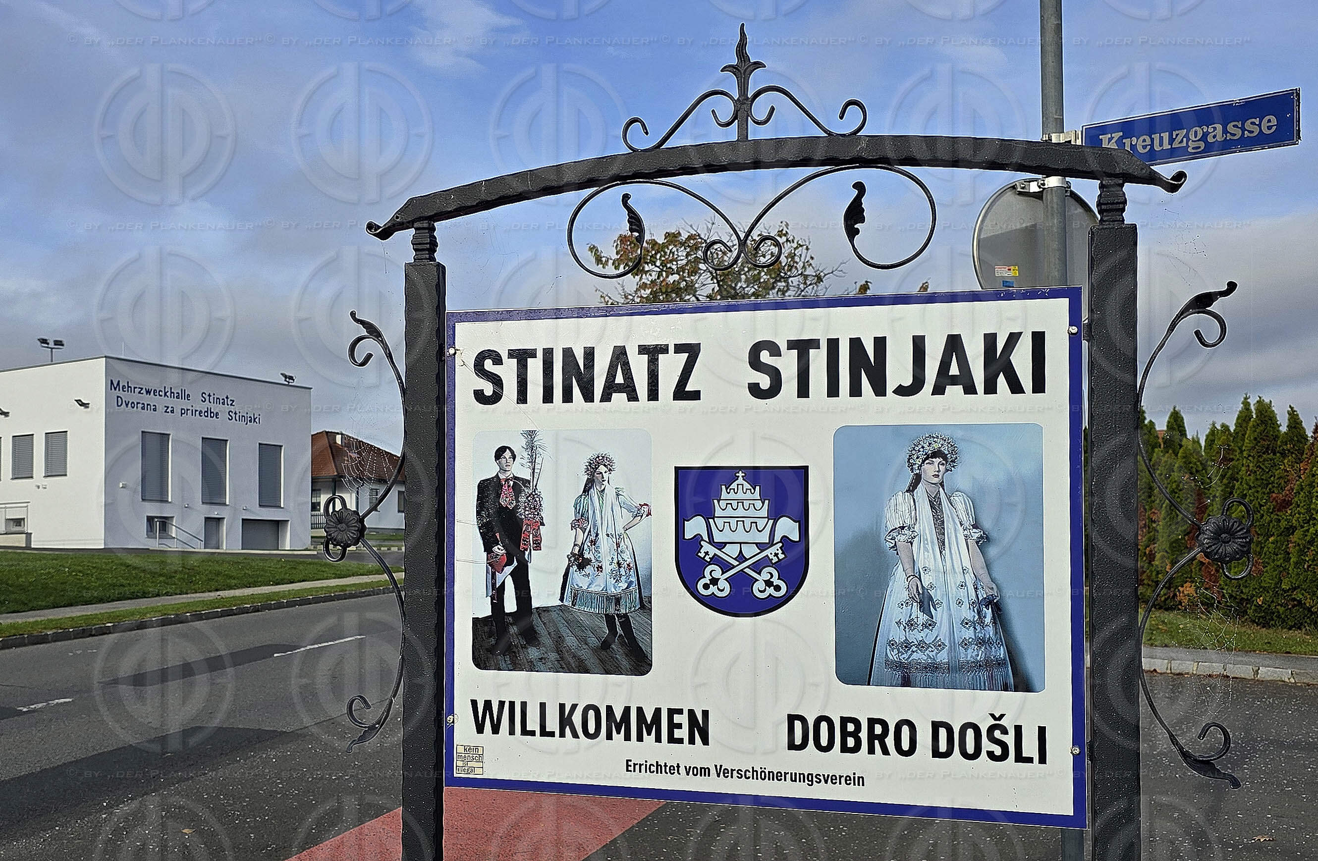 Bild zeigt: Ortseinfahrt und Mehrzweckhalle in der Marktgemeinde Stinaz (Stinjaki) im Bezirk Güssing/Südburgenland.