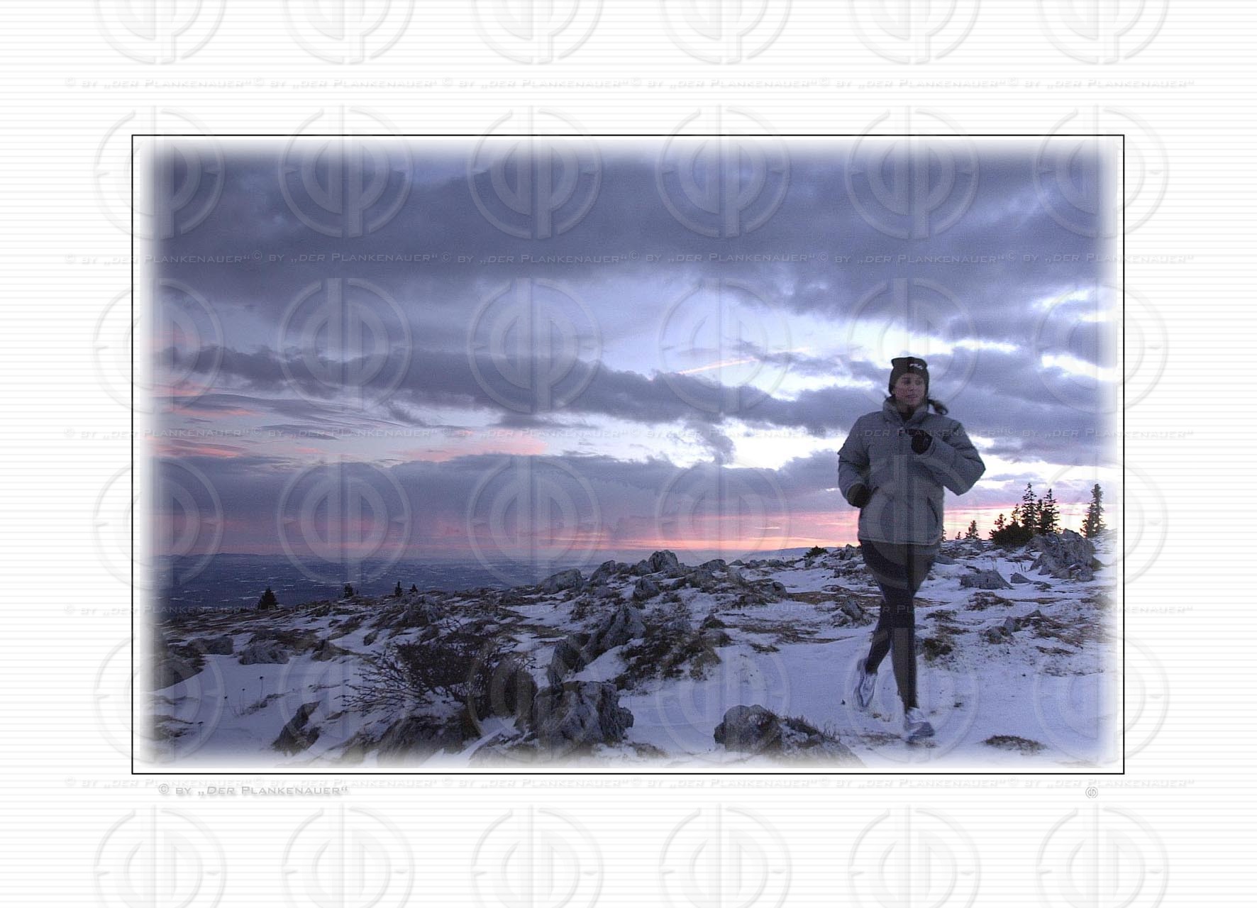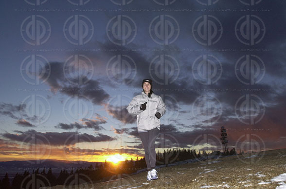 Objektbeschreibung: Die Laufbegeisterten laufen auch im Schnee und bei Minusgraden. Lauf-Model Alexandra nützt das letzte Licht des Tages.