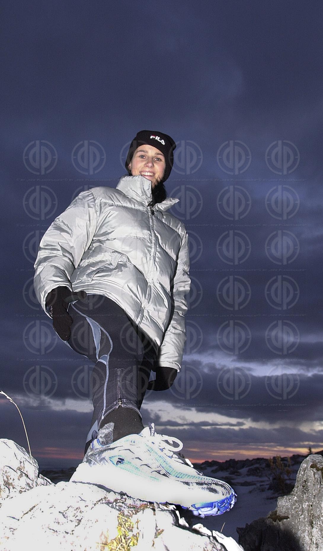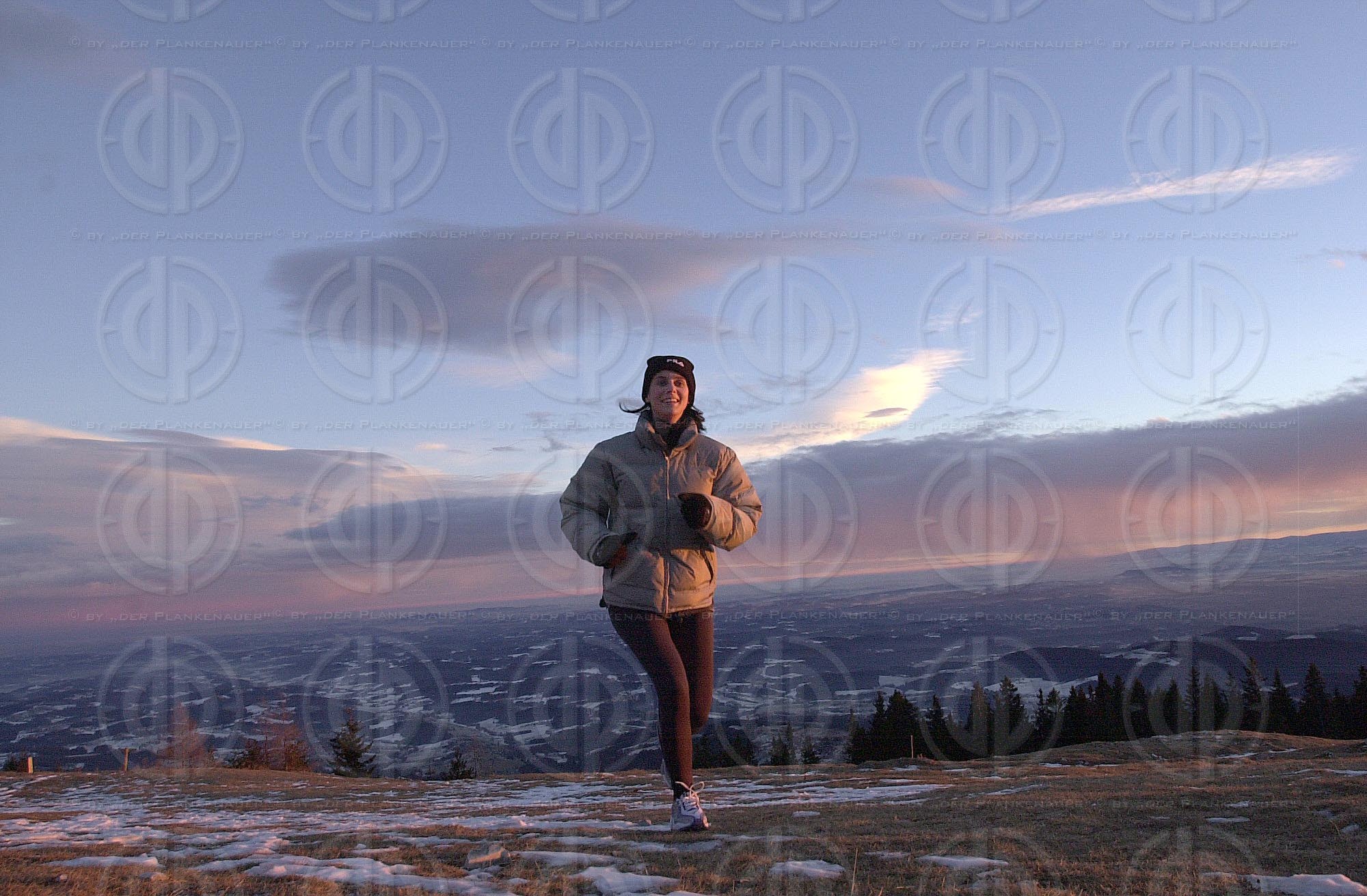 Objektbeschreibung: Die Laufbegeisterten laufen auch im Schnee und bei Minusgraden. Lauf-Model Alexandra nützt das letzte Licht des Tages.