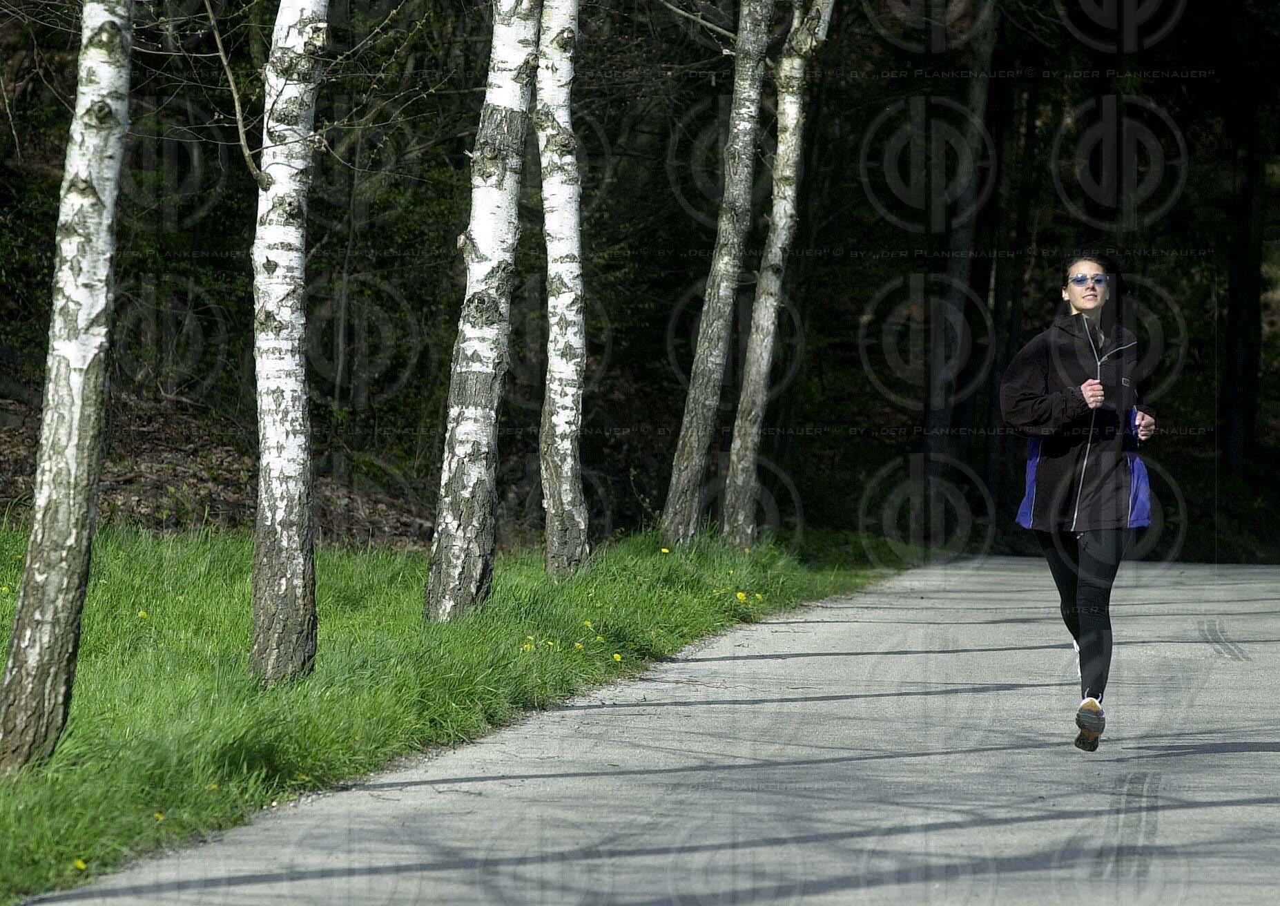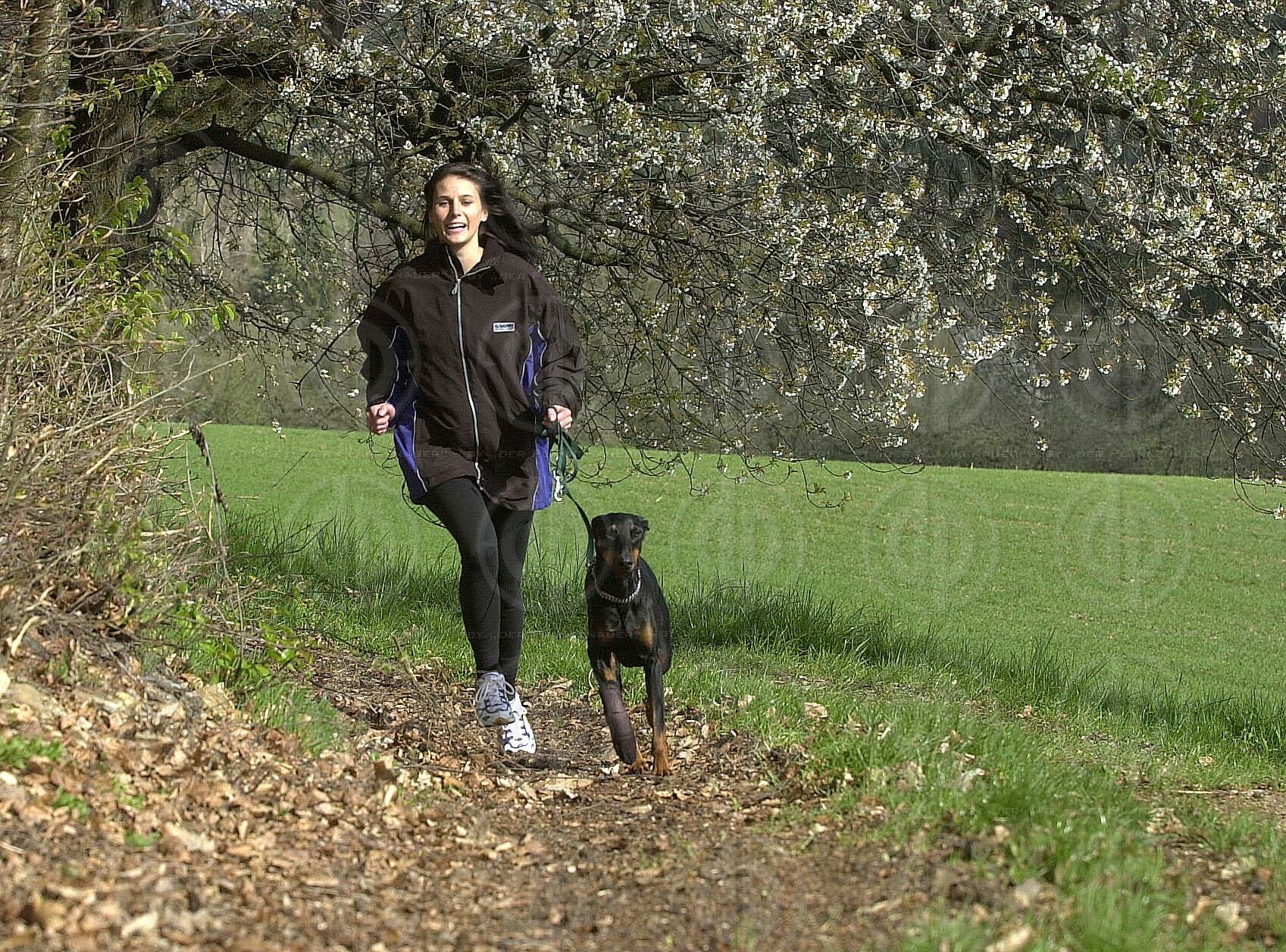 Objektbeschreibung: Model Alexandra nützt den schönen Tag zum Laufen mit der Dobermann-Hündin Simba.