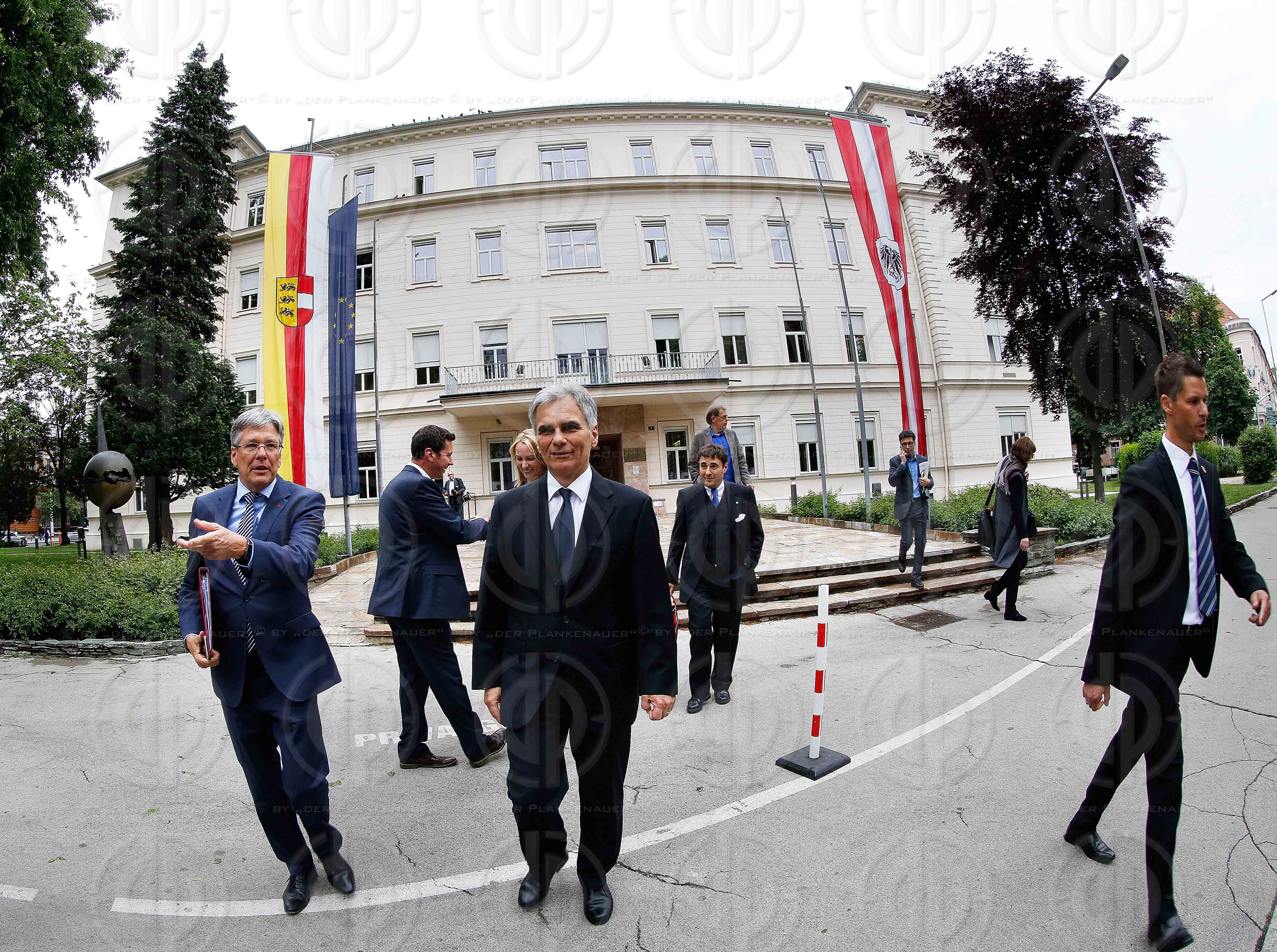 Bild zeigt: v.l. Dr. Peter KAISER, BK Werner FAYMANN am Arnulfplatz vor dem Landesreg.gebauede.
