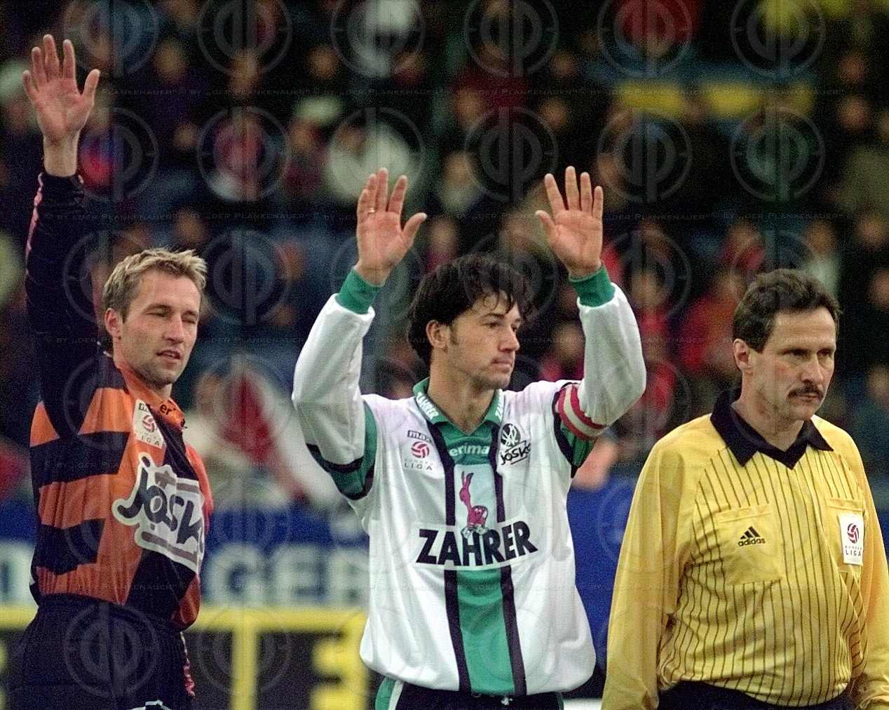 Objektbeschreibung: Gilbert Prilasnig wird von Thomas Zingler (links) und Reme Wagner (rechts) bedrängt.