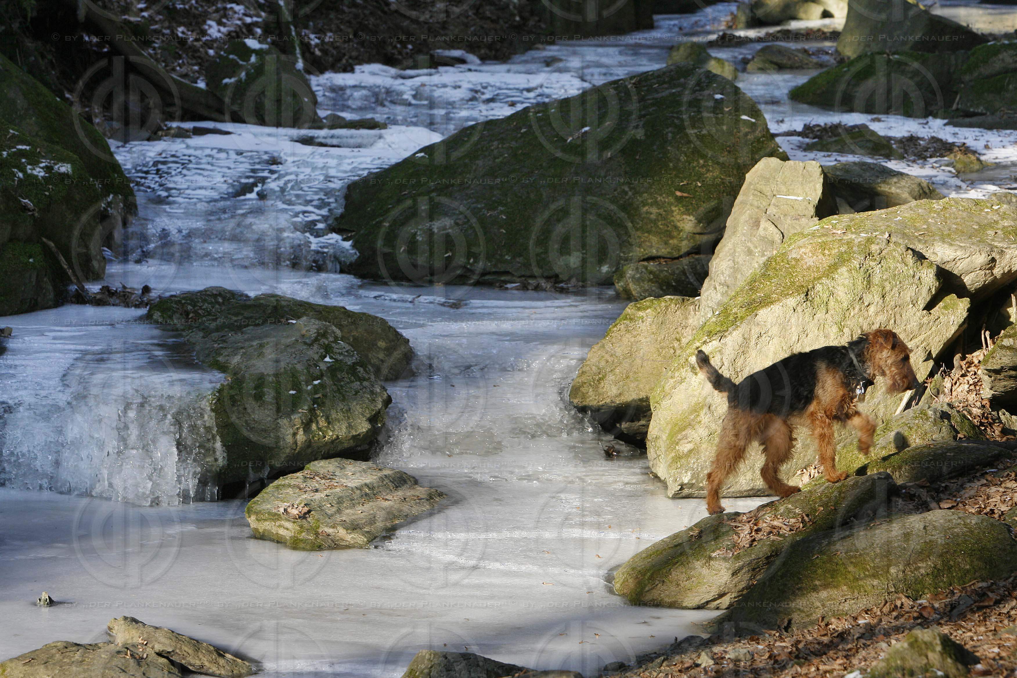 Bild zeigt: zugefrorener Klammbach, Welsh-Terrier-Hündin Chessy von der Fuchshube.