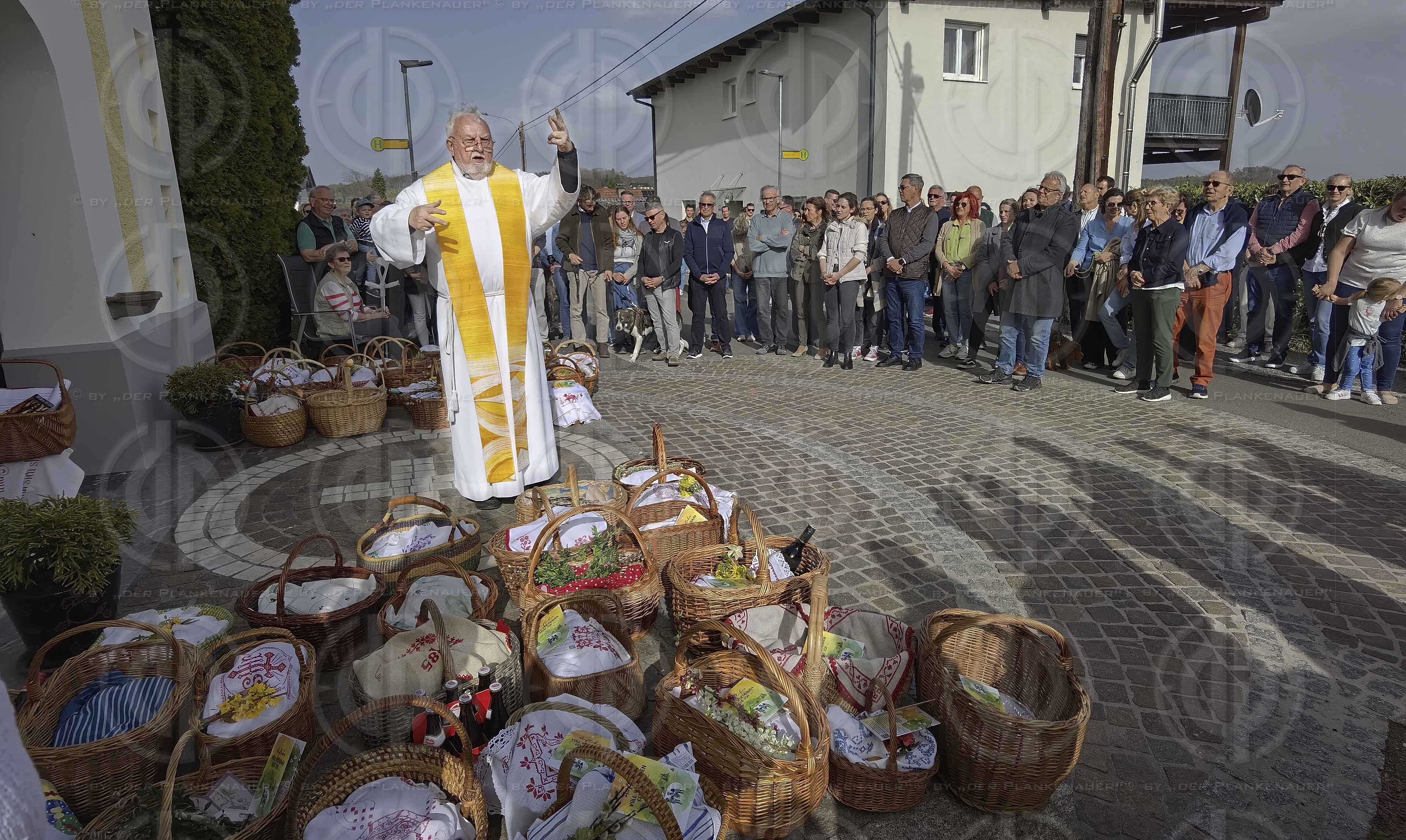 Bild zeigt: v.l. Pater Leo THENNER SDS segnet die Körbe mit den Ostergaben.