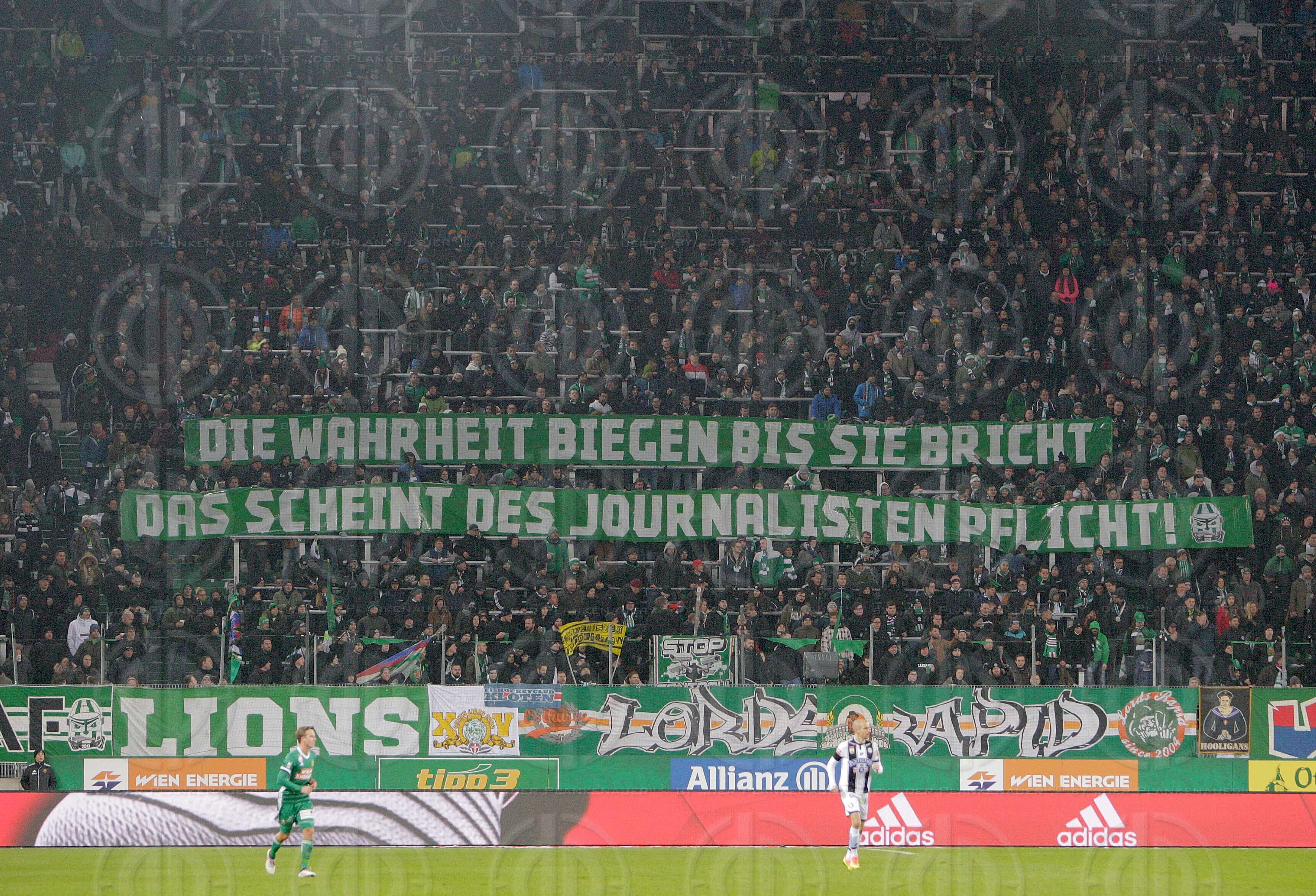 Bild zeigt: v.l. Transparent der Rapid-Fans der Osttribuene Die Wahrheit biegen bis sie bricht, das scheint des Journalisten Pflicht.