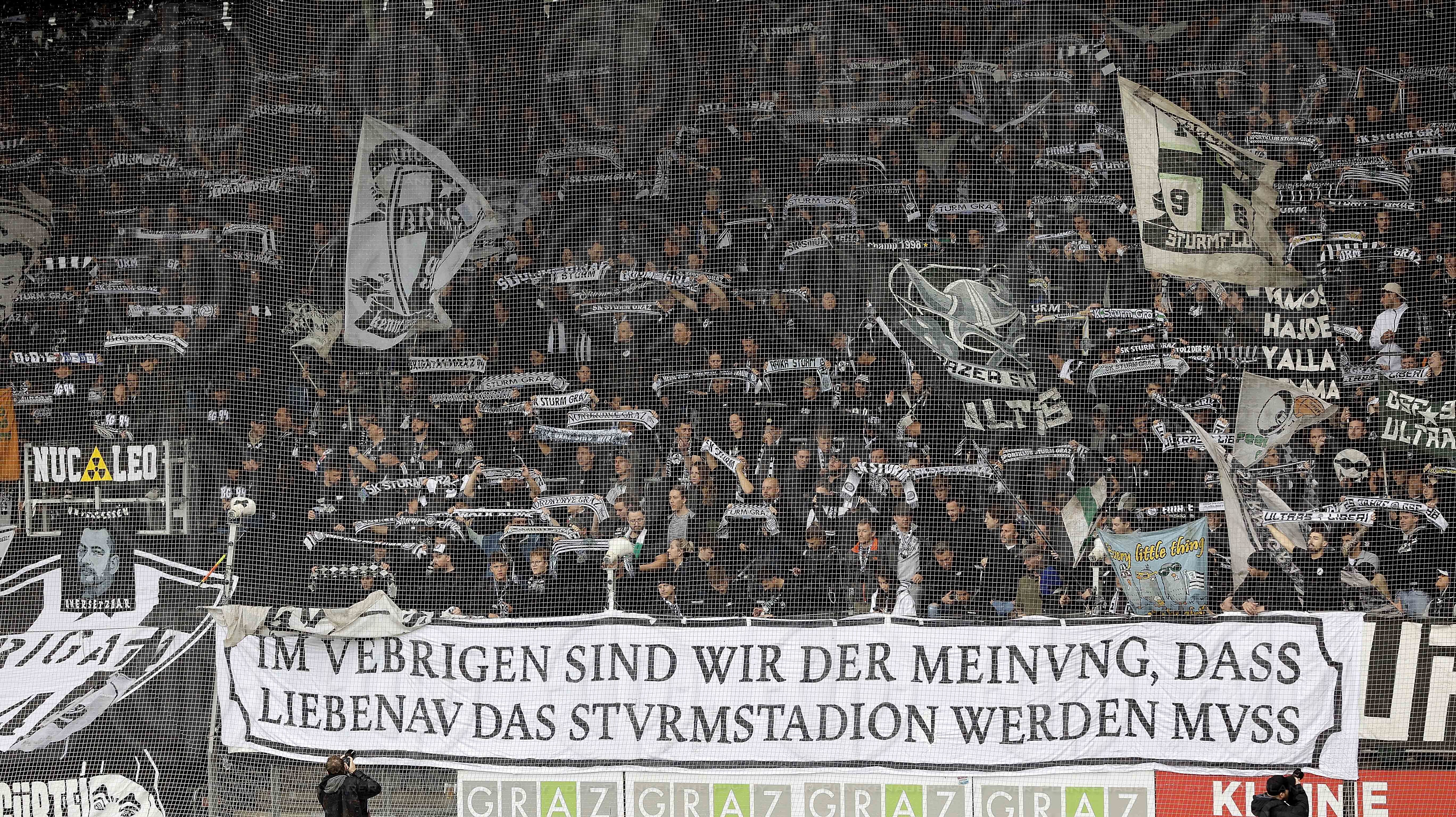 Bild zeigt: v.l. Fans der Nordtribüne mit dem Transparent "Im Übrigen sind wir der Meinung, dass Liebenau das Sturmstadion werden muss"..