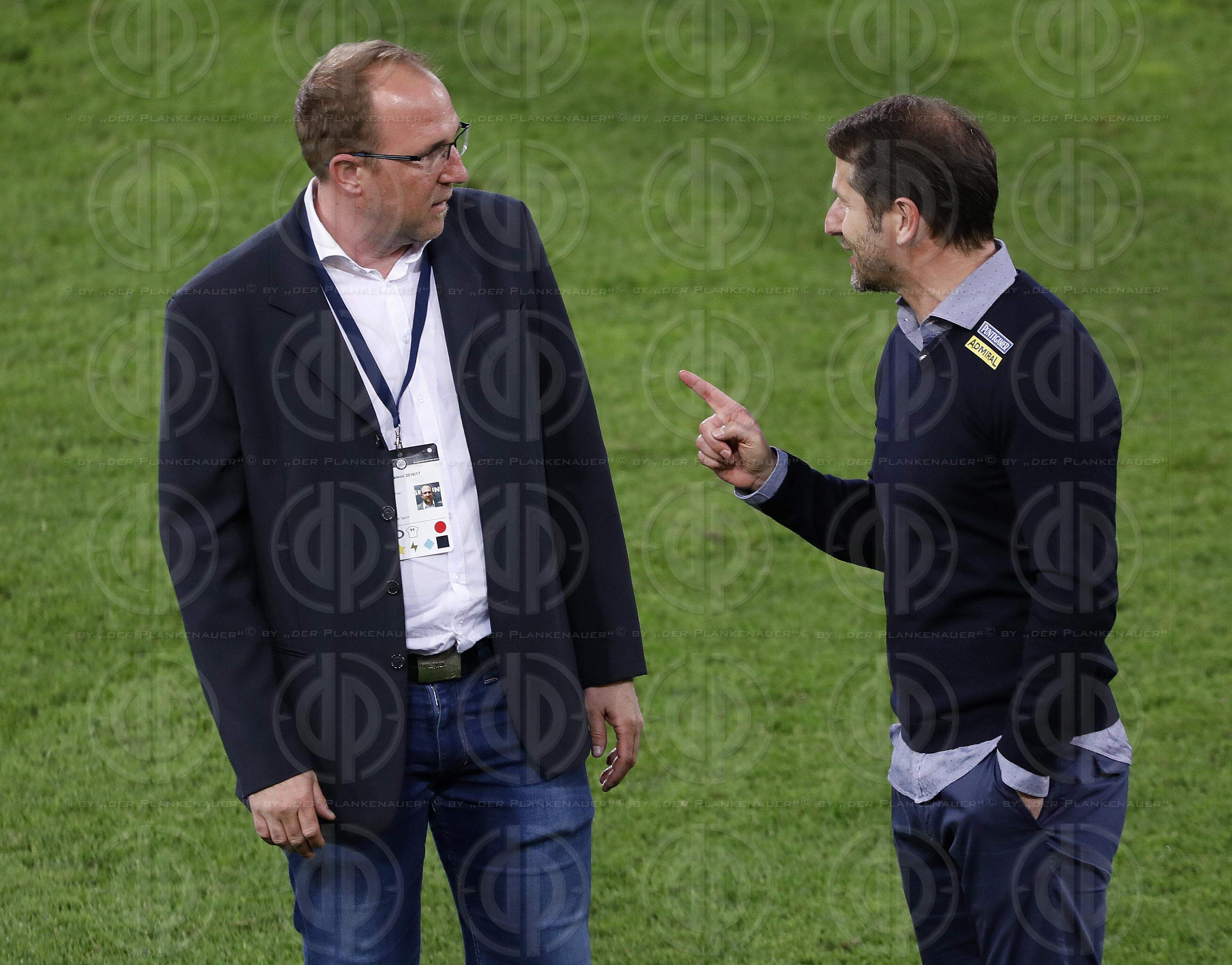 Fussball tipico-Bundesliga SK Puntigamer Sturm Graz vs. SKN St. Poelten (3:2 Endstand, 2:1 Pause) am 06.05.2017.Bild zeigt: v.l. Sportdir. Guenter KREISSL, Trainer Franco FODA.