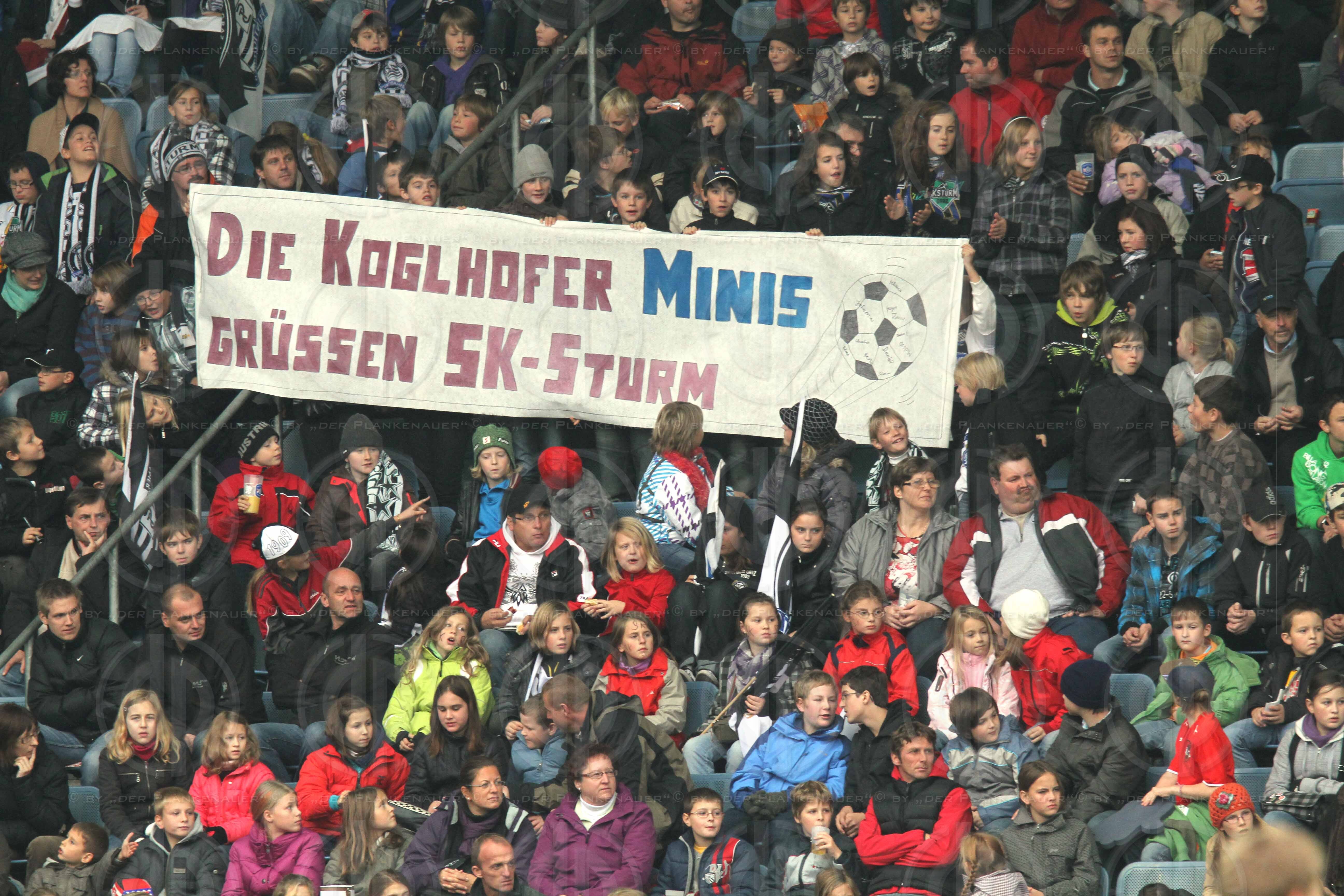 Bild zeigt: v.l. Kinder am Fussballplatz mit Transparent die Kogelhofer Minis grüssen den SK Sturm