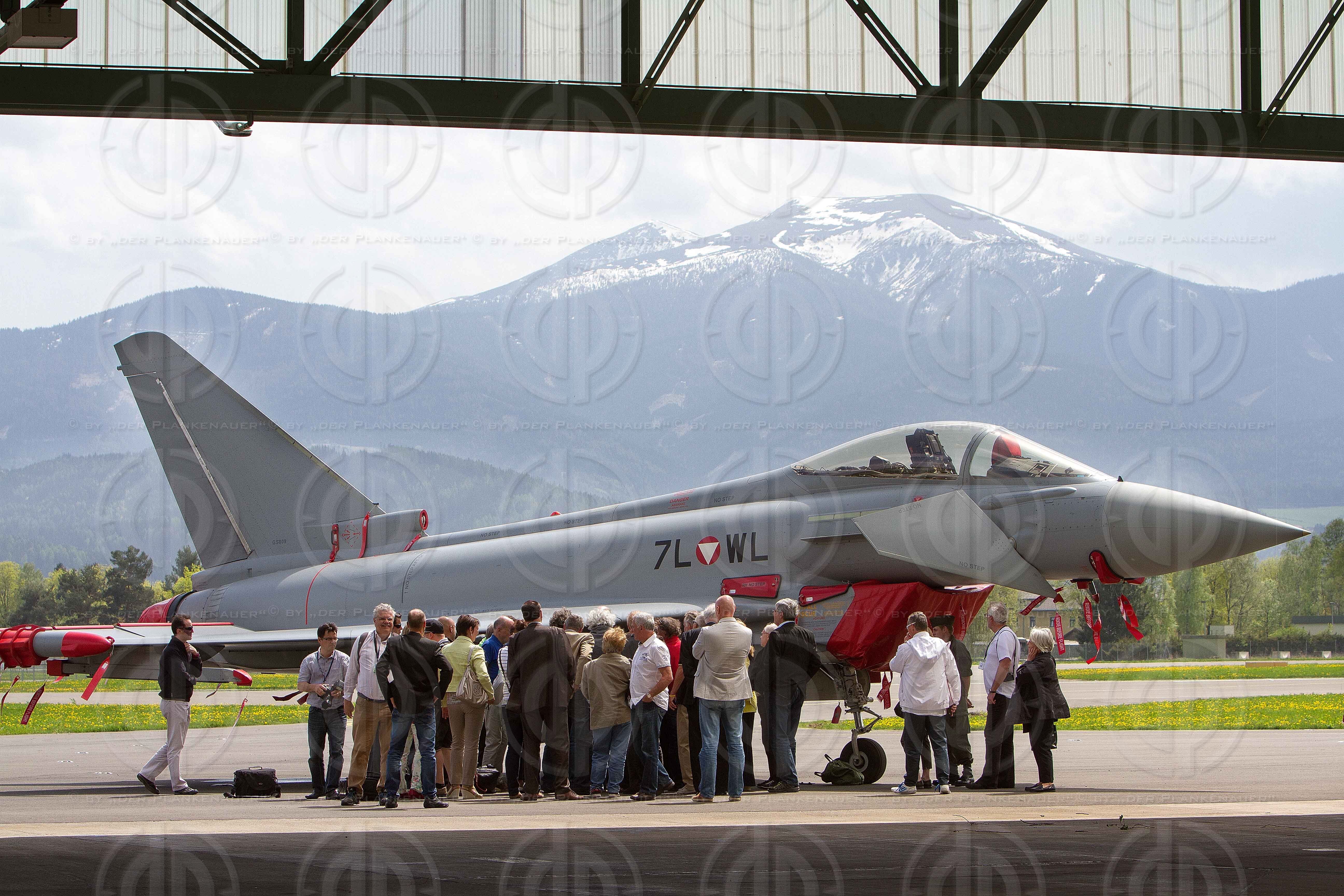 Bild zeigt: v.l. Journalisten bestaunen den Eurofighter, im Hintergrund der Zirbitzkogel mit Schnee.