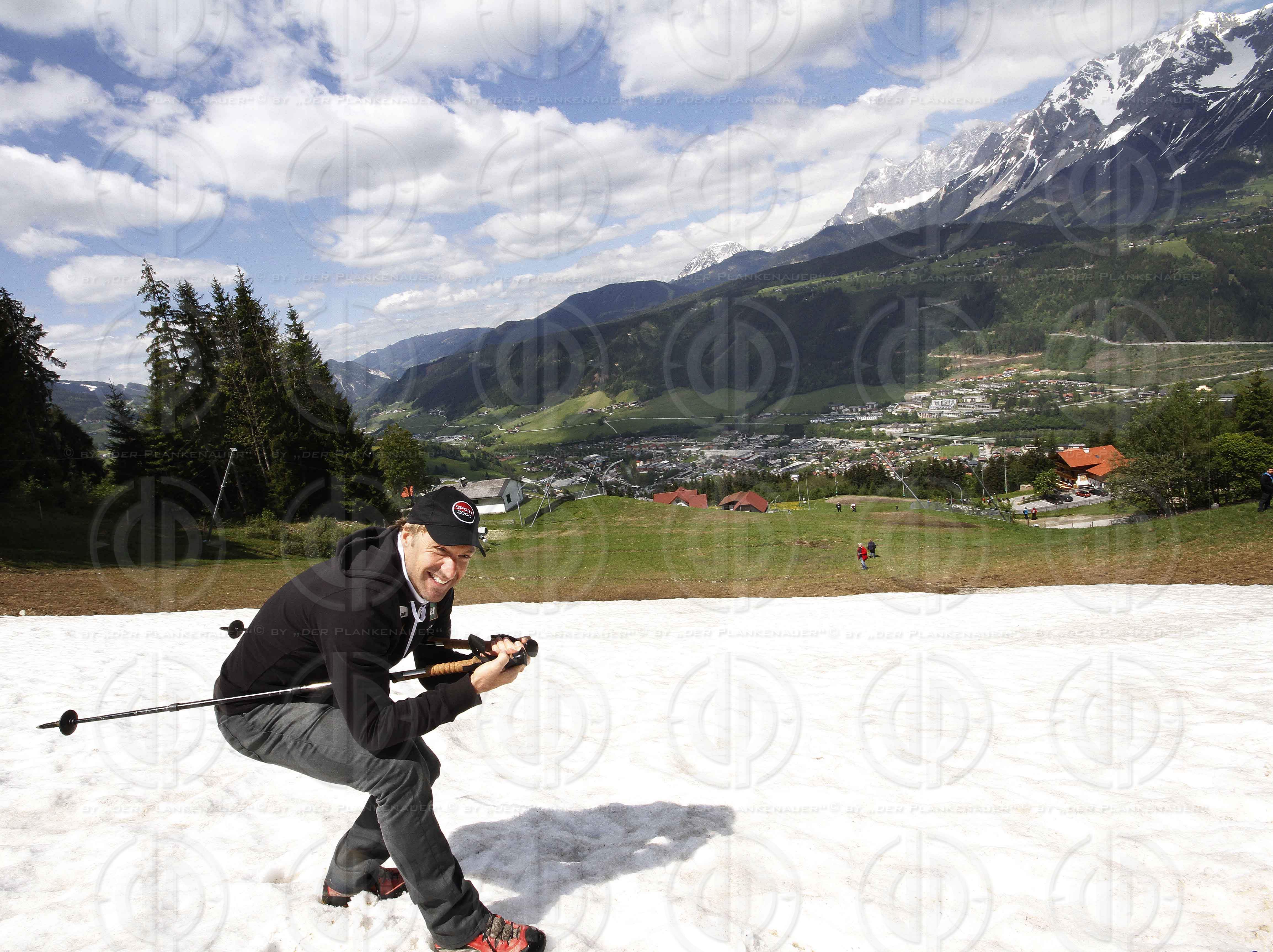 Bild zeigt: v.l. Hans KNAUS erklärt die Abfahrtsstrecke , hinten das Dachsteinmassiv.