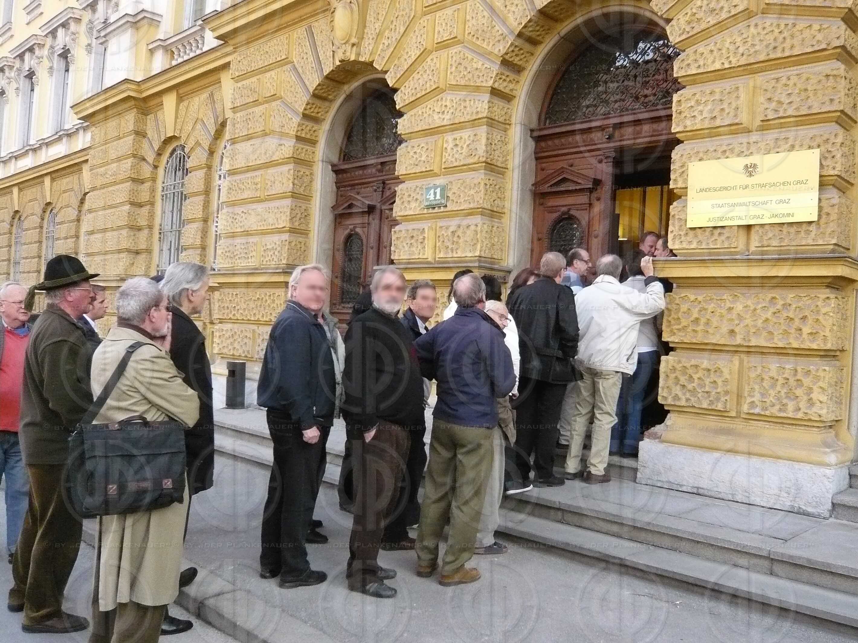 Bild zeigt: v.l. Prozess-Besucher stehen vor dem LG Schlange