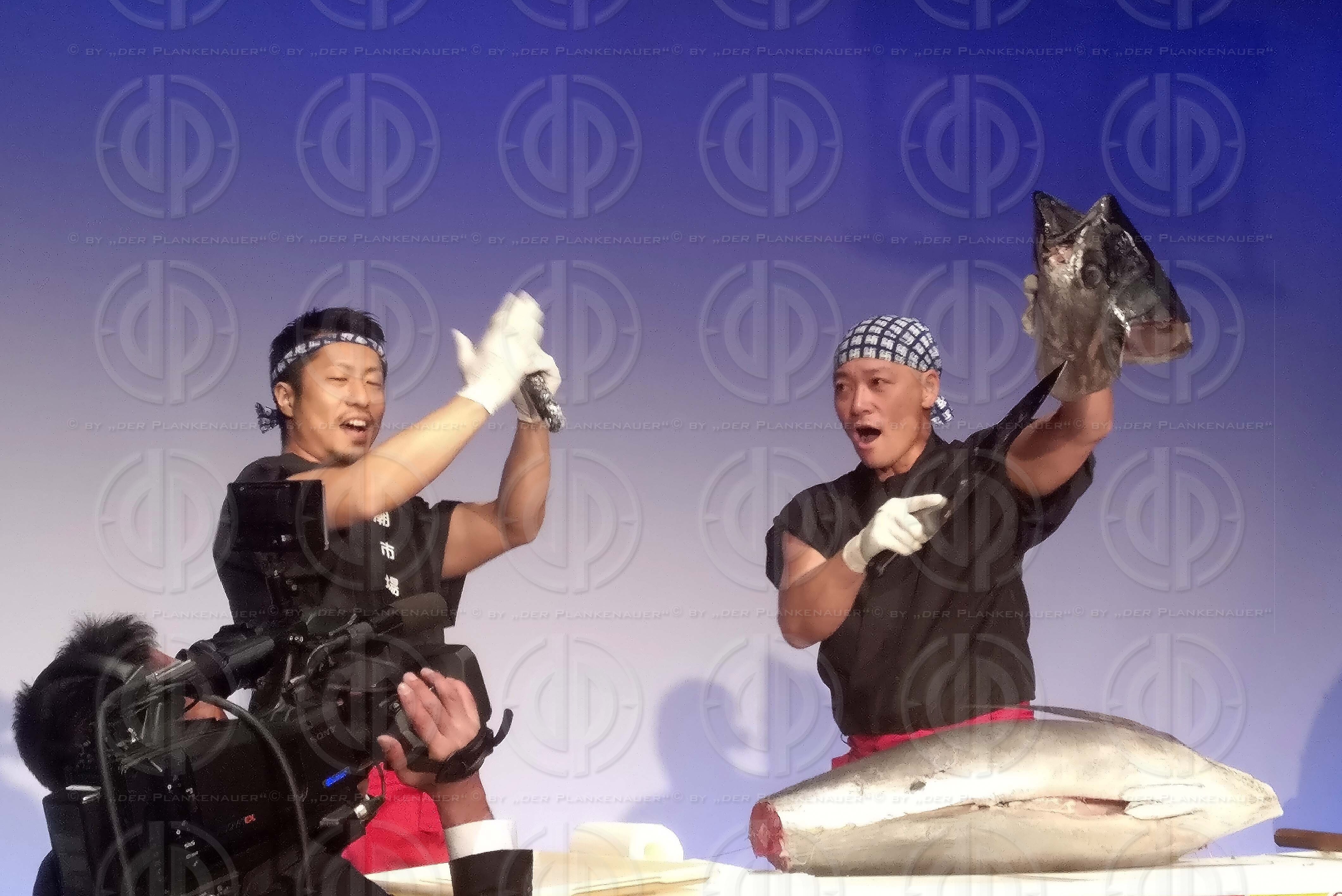 Bild zeigt: v.l. Finisher-Party , riesiger Thunfisch wird zerlegt.