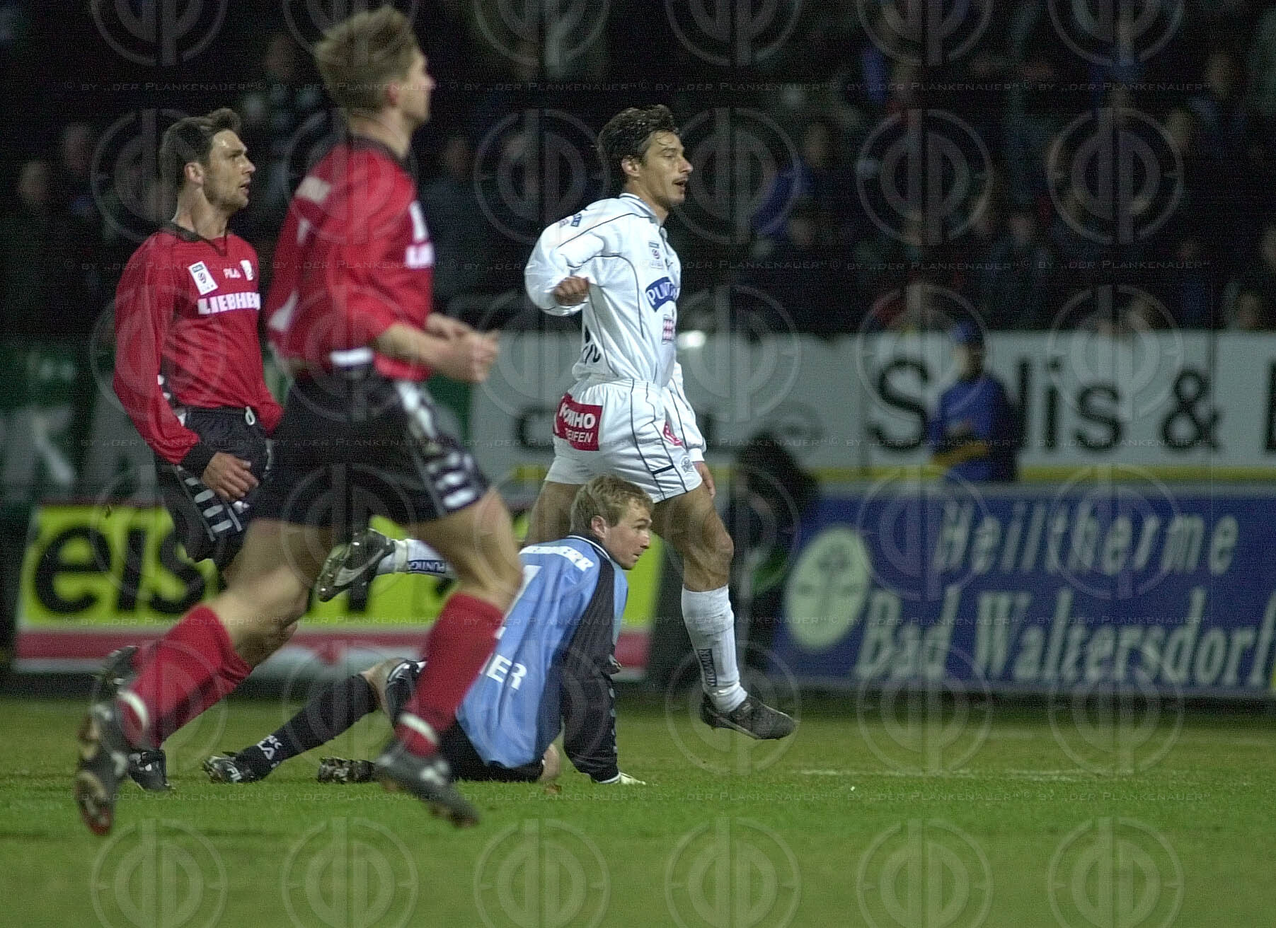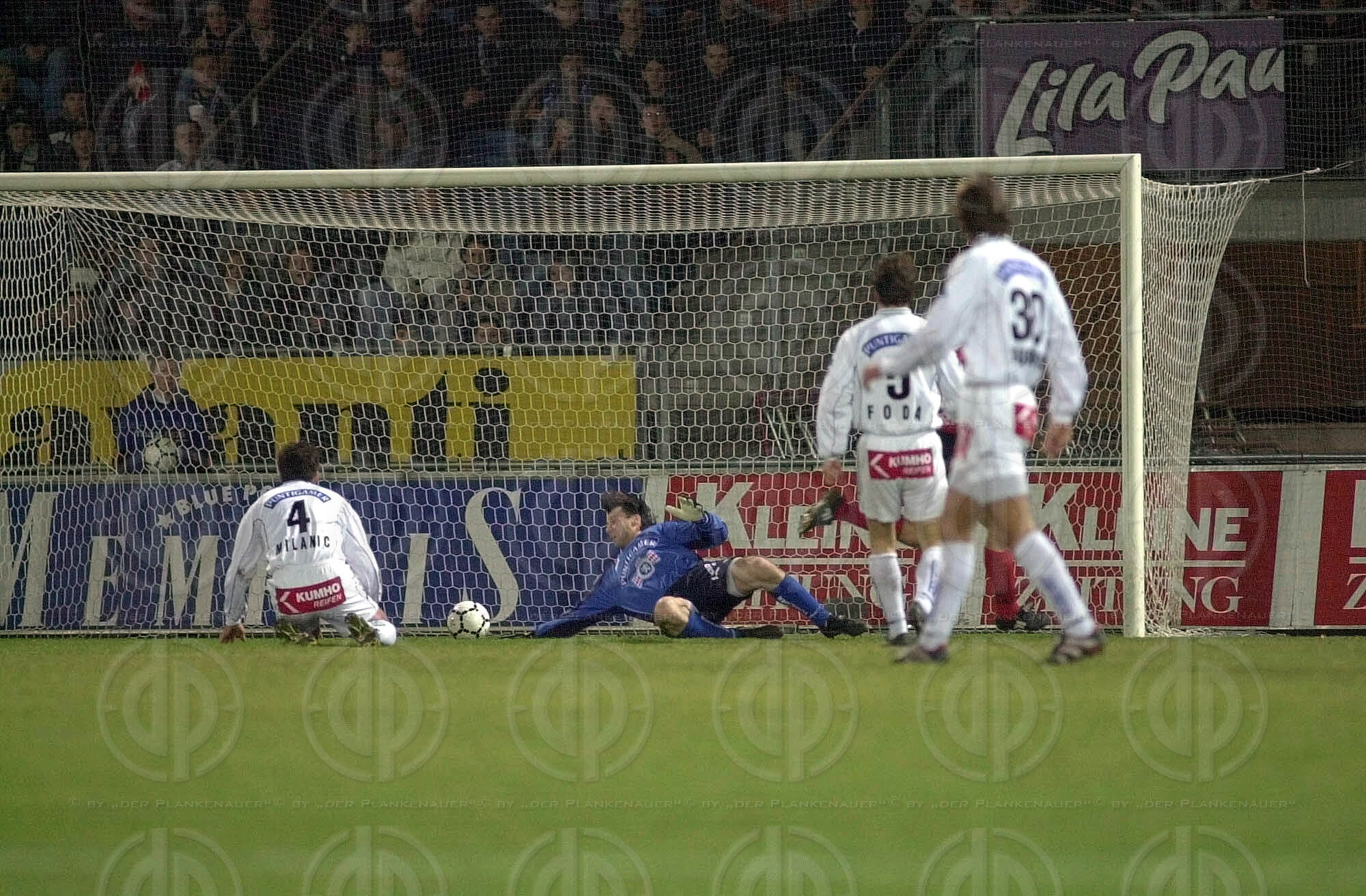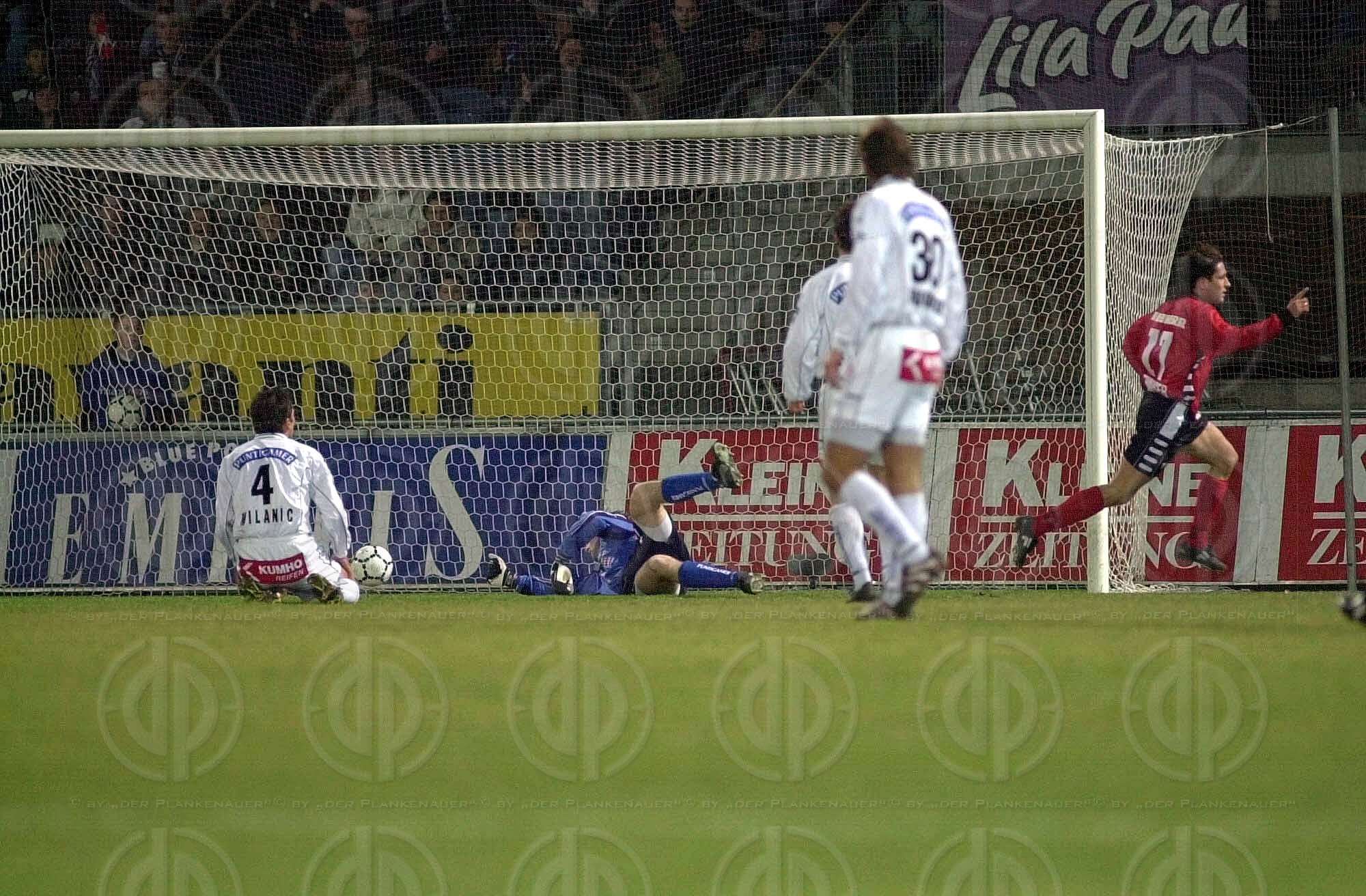 Objektbeschreibung: Tor durch Martin Amerhauser nach Fehler von Darko Milanic. Franco Foda und Andres Fleuquin schauen Tormann Josef Schicklgruber zu