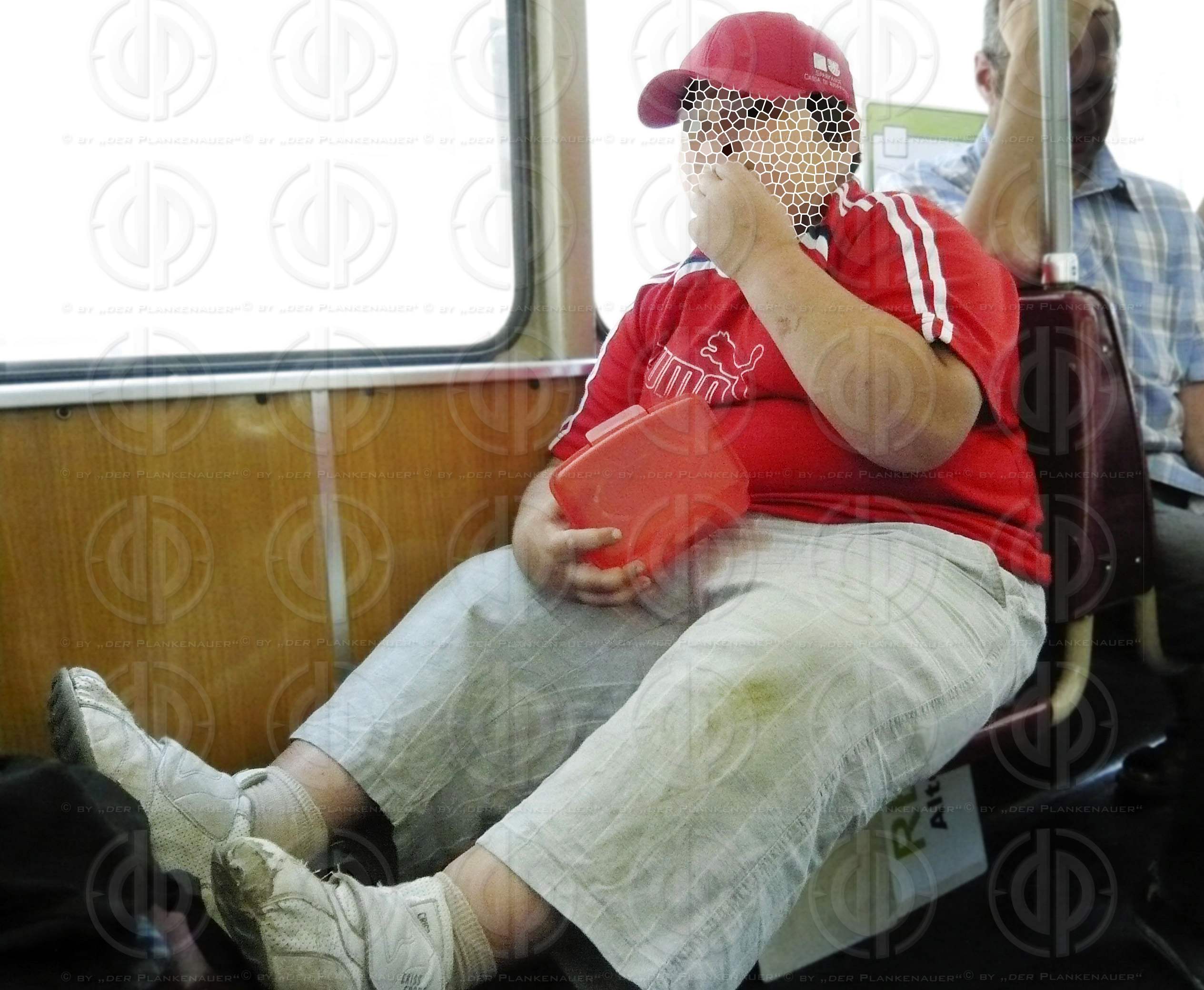 Bild zeigt: v.l. Uebergewichtiges Kind isst seine Jause in der Strassenbahn.