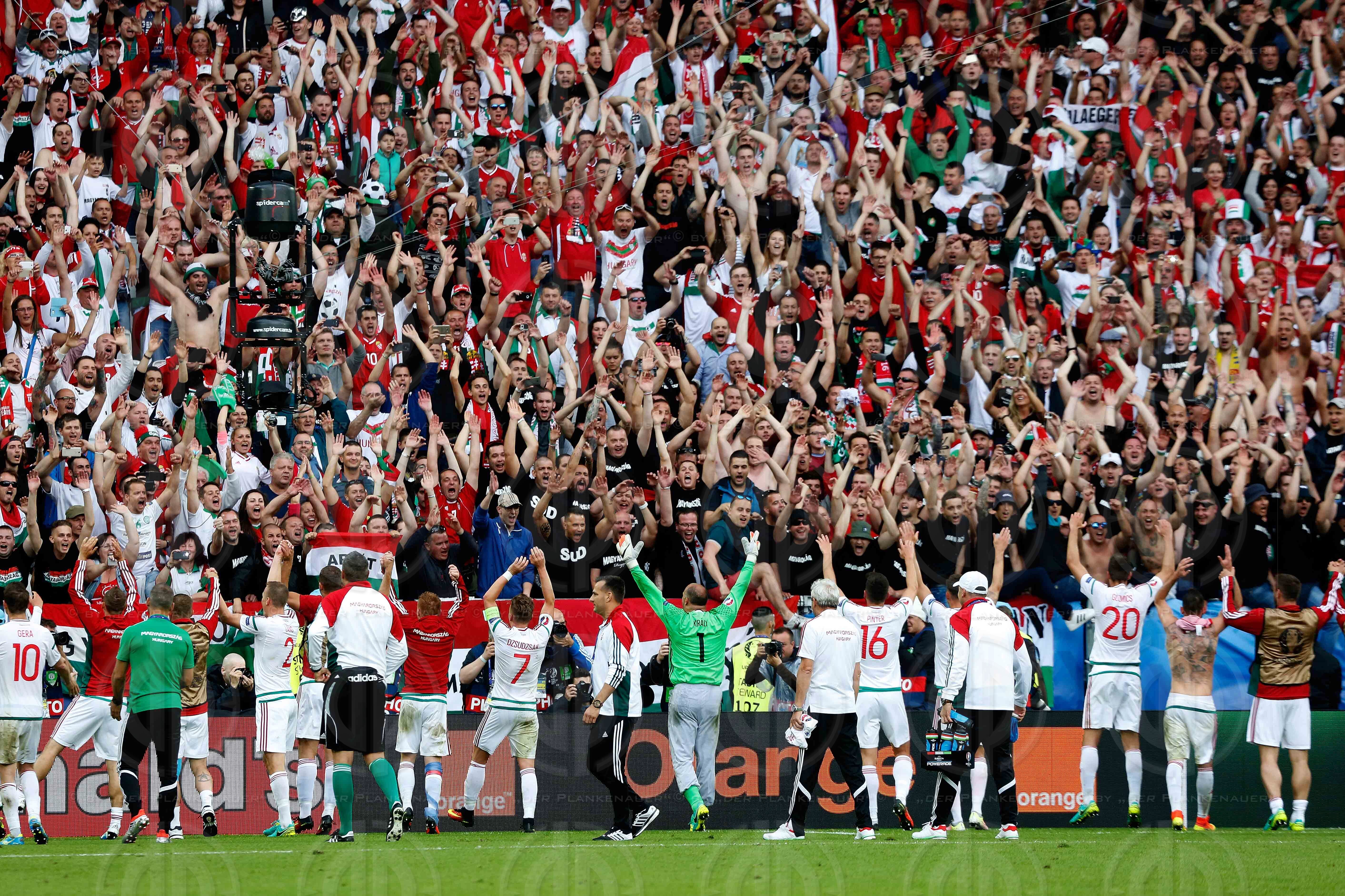Bild zeigt: v.l. Die ungarische Mannschaft , Mitte Tormann Gabor KIRALY, jubelt mit den Fans