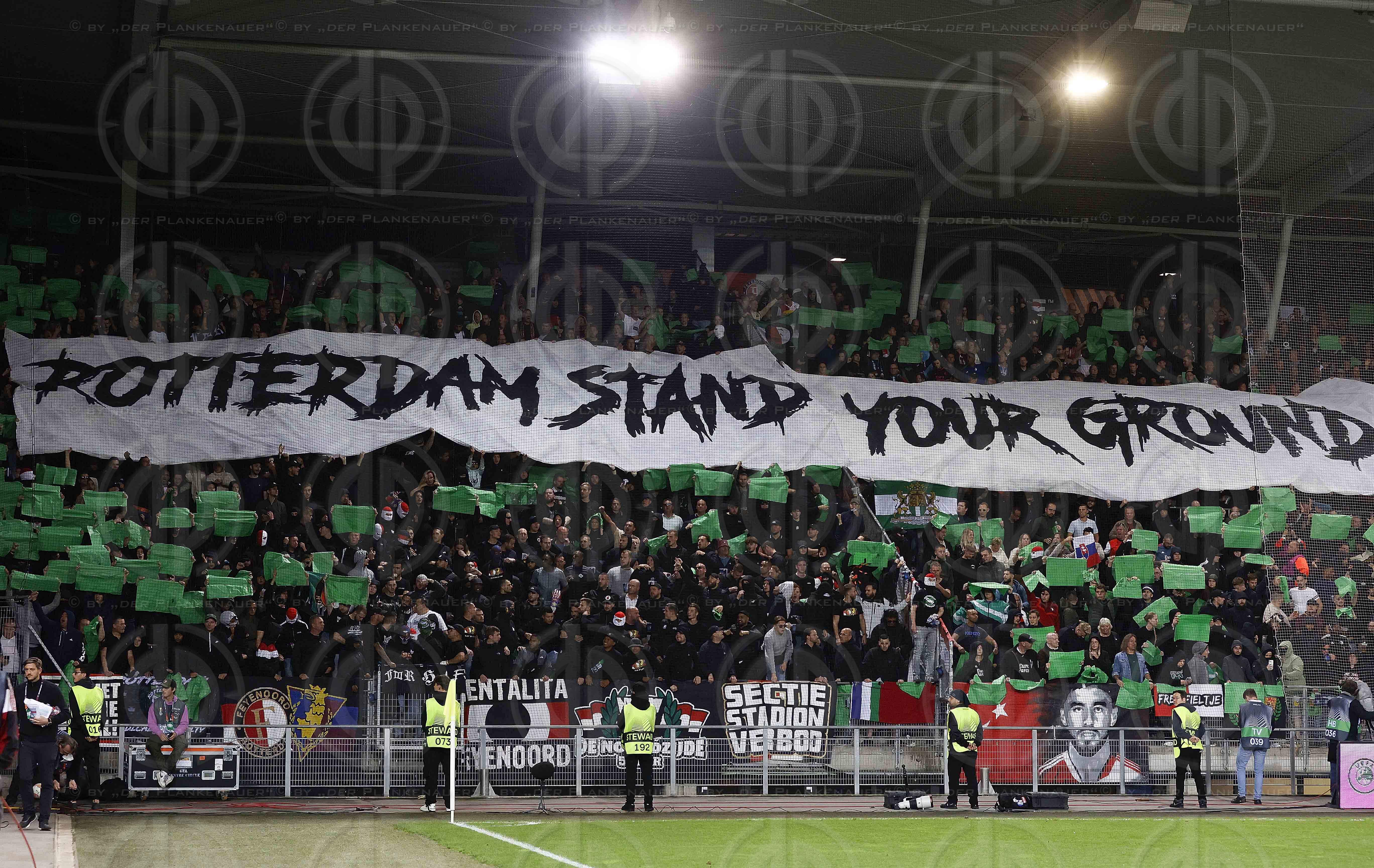 Bild zeigt: v.l. Noch friedliche Feyenoord-Fans zu Spielbeginn mit Transparent Rotterdam stand your ground.