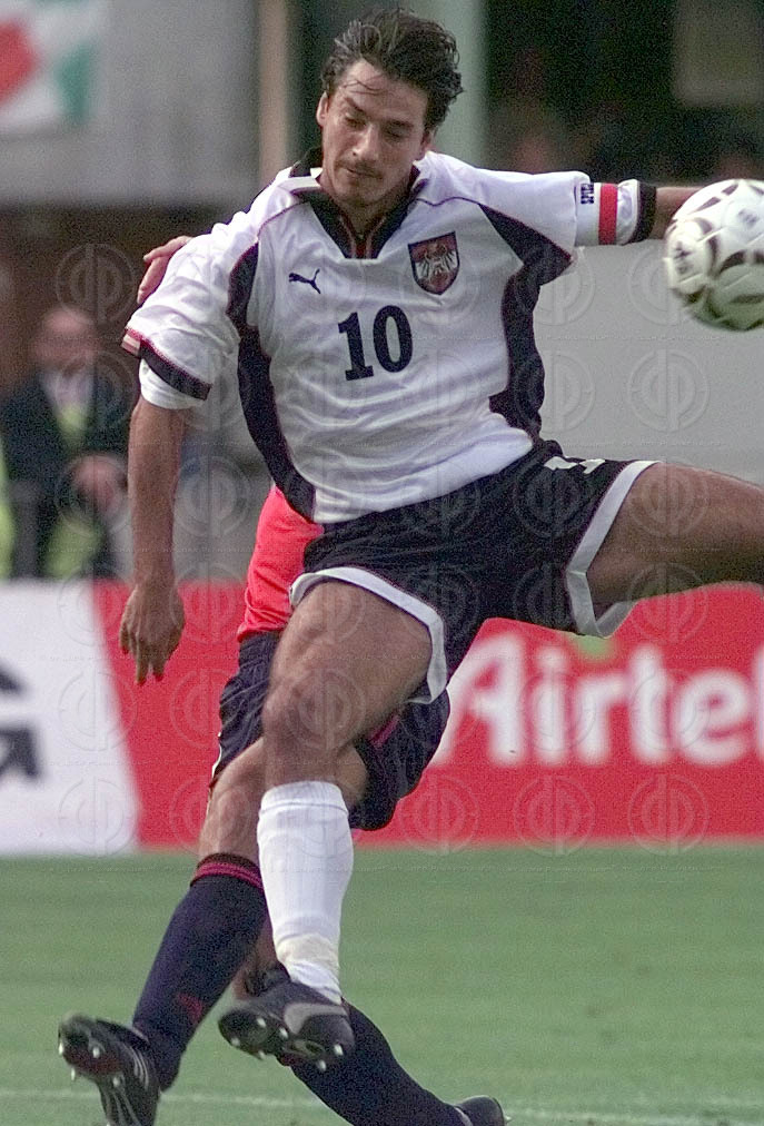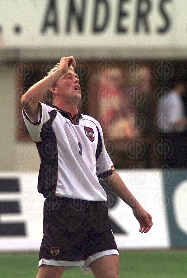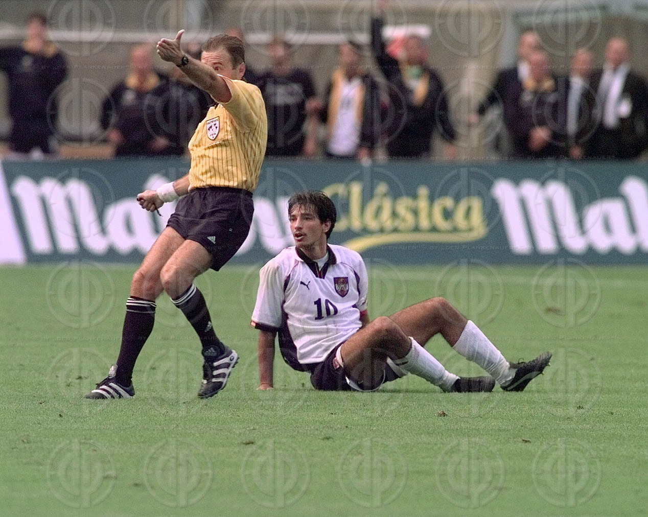 Bild zeigt: von links Schiedsrichter Michel Piraux, am Boden Ivica Vastic
