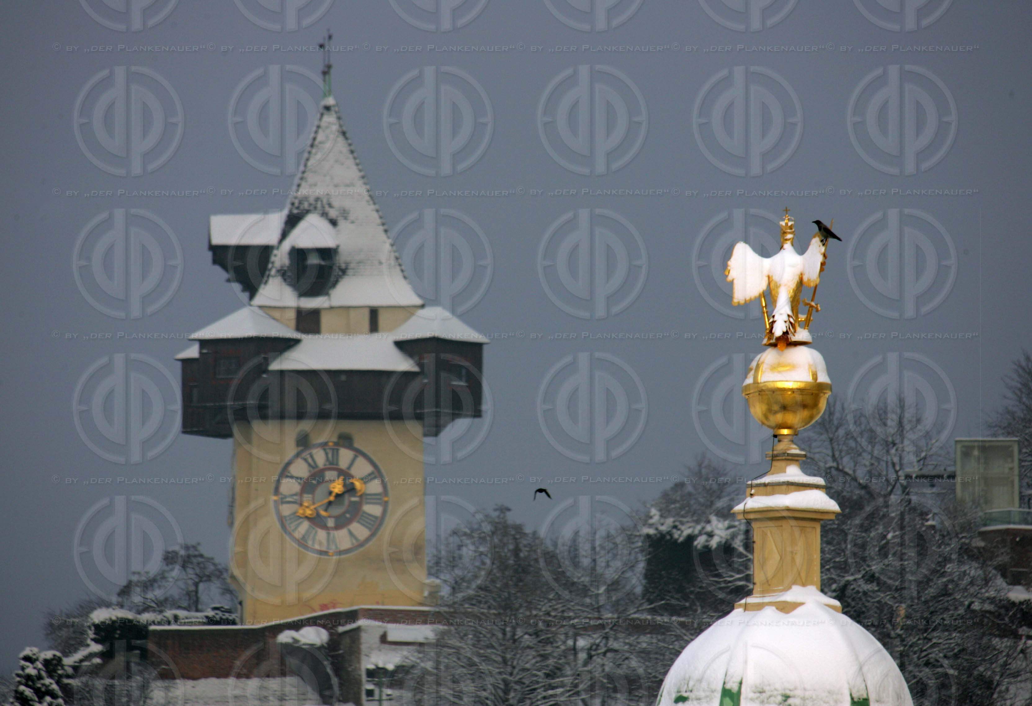 Bild zeigt: Die Landeshauptstadt Graz mit verschneiten Dächern. Blick über den Dom auf den Schlossberg mit Uhrturm und Liesl (ganz rechts).
